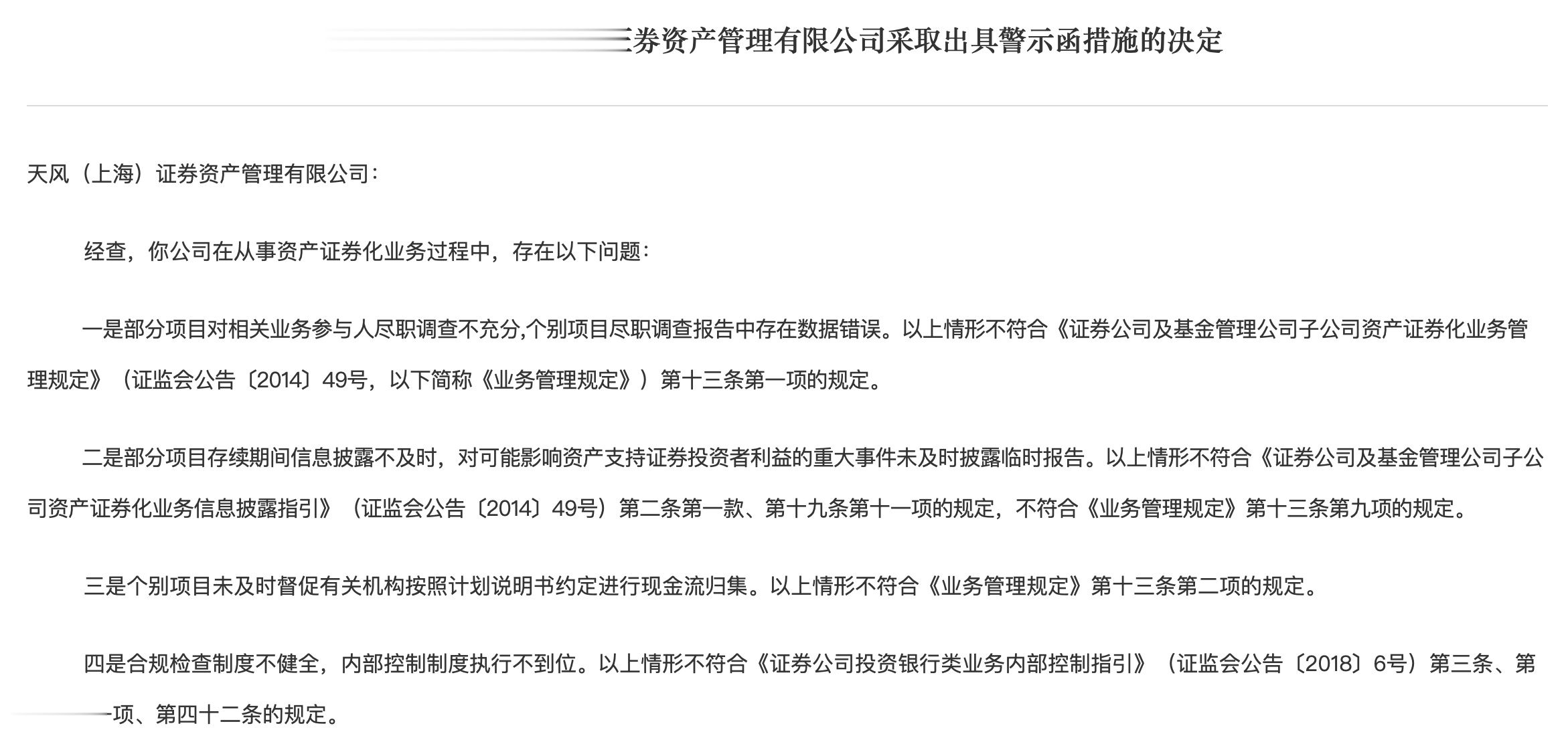 2025年1月26日,上海证监局对天风(上海)证券资产管理有限公司出具警示函,指出其在资产证券化业务中存在尽调不充分、存续期信息披露不及时、现金流归集督促不到位、合规检查制度不健全等问题,要求整改。
