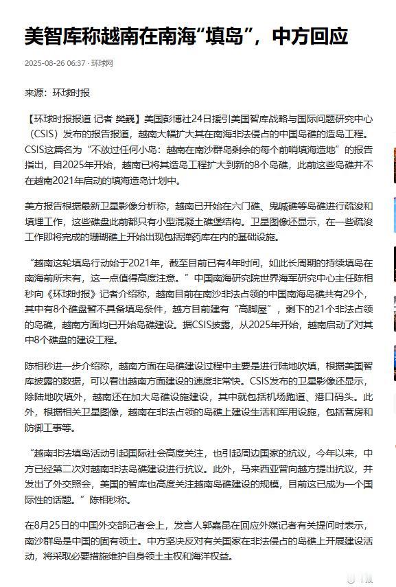 越南在南海一口气填了29个岛礁,今年又新添8块,机场弹药库雷达站全上线,面积已经追到我们曾控礁盘的七成,再不止步,他们就能把六门礁鬼喊礁连成一条海上长城。 事情要从上世纪七八十年代说起,那时我们海军够不着南沙,越南先是以 “解放” 为名抢了南越之前占的 6 个岛礁,后来又跟赶集似的陆续霸占了染青沙洲、万安滩等 18 个礁盘,到 90 年代再添 5 个,硬生生把实控岛礁总数堆到了 29 个。 1988 年在赤瓜礁附近还敢跟我们叫板,那会儿鬼喊礁、景宏岛这些离赤瓜礁不远的礁盘,早被他们偷偷插上旗了。 刚开始越南也就是在礁盘上搭几个高脚屋,派几个人守着,后来看我们搞填海造岛效果显著,立马学起了 “抄作业”。 先是把高脚屋慢慢扩建成水泥礁堡,后来干脆下了血本,从荷兰弄来绞吸式挖泥船,这下效率直接翻了好几倍。 之前只能小打小闹修修补补,现在昼夜不停抽沙,半年就能填出 4200 亩地,一年造几十个足球场都不在话下。 就说鸿庥岛吧,四年前还只有 0.08 平方公里,现在硬生生扩到了 0.6 平方公里,面积涨了近十倍,岛上还新建了船坞,俨然一副 “海上堡垒” 的模样。 更夸张的是柏礁,原本就几个破高脚屋,三年时间被填成 2.8 平方公里的大岛,还挖了 11.3 米深的航道,万吨军舰都能停进去,3000 米长的机场跑道都快铺完了,以后苏 - 30 战机都能在这起降。 到 2025 年 3 月,越南在南海的造陆总面积已经达到 9.05 平方公里,刚好追到我们曾控礁盘面积的七成,这还不算完,今年又偷偷把填海工程扩到了 8 个新礁盘,六门礁、鬼喊礁这些之前只有小水泥堡的地方,现在全是疏浚船的身影。 这算盘打得比谁都精,趁着中菲在仁爱礁、仙宾礁对峙的功夫,闷声搞扩张,东盟外交官都调侃他们是 “沉默的渔夫”,等着坐收渔利。 现在他们非法占的 21 个具备条件的岛礁,全在搞建设,没有一个闲着的。 填岛可不是最终目的,军事化才是核心。 鸿庥岛早就装上了雷达站,还修了直升机坪,毕生礁和日积礁上密密麻麻全是弹药库和机枪阵地,南子岛这些老据点更是配了十几辆坦克和二十多门火炮。 光雷达站就建了 4 个,弹药库也有 2 座,等于把防空网直接向南推了 500 公里,马六甲到东亚的航运要道都想插一手,顺便还能抢南海的油气资源。 现在六门礁和鬼喊礁的疏浚工作都快完了,珊瑚礁上已经开始建弹药库,照这节奏,用不了多久就能把这一串礁盘连起来,真成了他们的 “海上长城”。 越南这操作也是摸准了门道,早年靠 “趁虚而入” 占了地盘,后来又学会 “抄作业” 搞填海,现在用上了先进设备提速,还专挑别人注意力分散的时候发力。 从高脚屋到能停战机的人工岛,从偷偷插旗到明目张胆建军事设施,一步步把礁盘变成自己的势力范围,面积追得飞快,军事化也没落下,照这劲头,真打算把南沙这片海域当成自家后院来圈了。