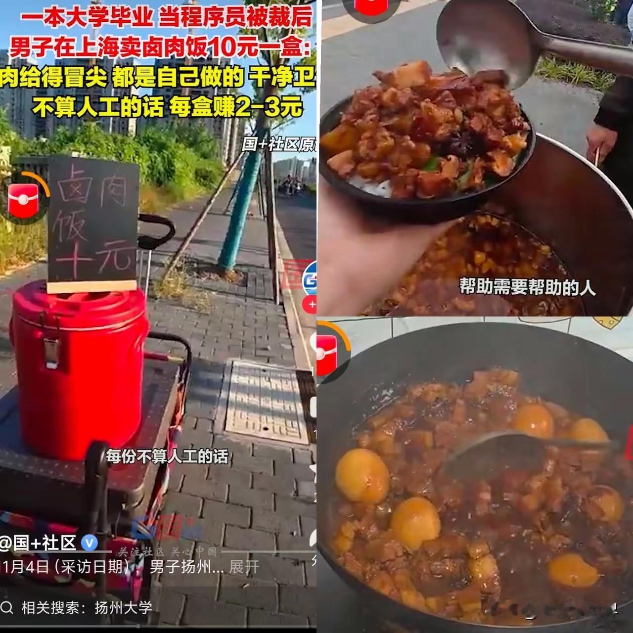 好青年! 一本大学毕业的程序员,被公司裁员以后在上海街头卖起了卤肉饭。肉给的冒尖满,都是自己做的,真材实价干净卫生,关键还不贵,只收10块钱! 男子直言不算人工的话每份能赚个两三块钱。附近买饭的都是很多都是体力劳动者,最看重的是经济实惠。你听听,不算人工!这小伙是有多实在啊!上海打工人午餐 卤肉饭 上海外卖业 上海小伙开面馆 上海被裁员 上海外卖行业 沈当家卤肉饭