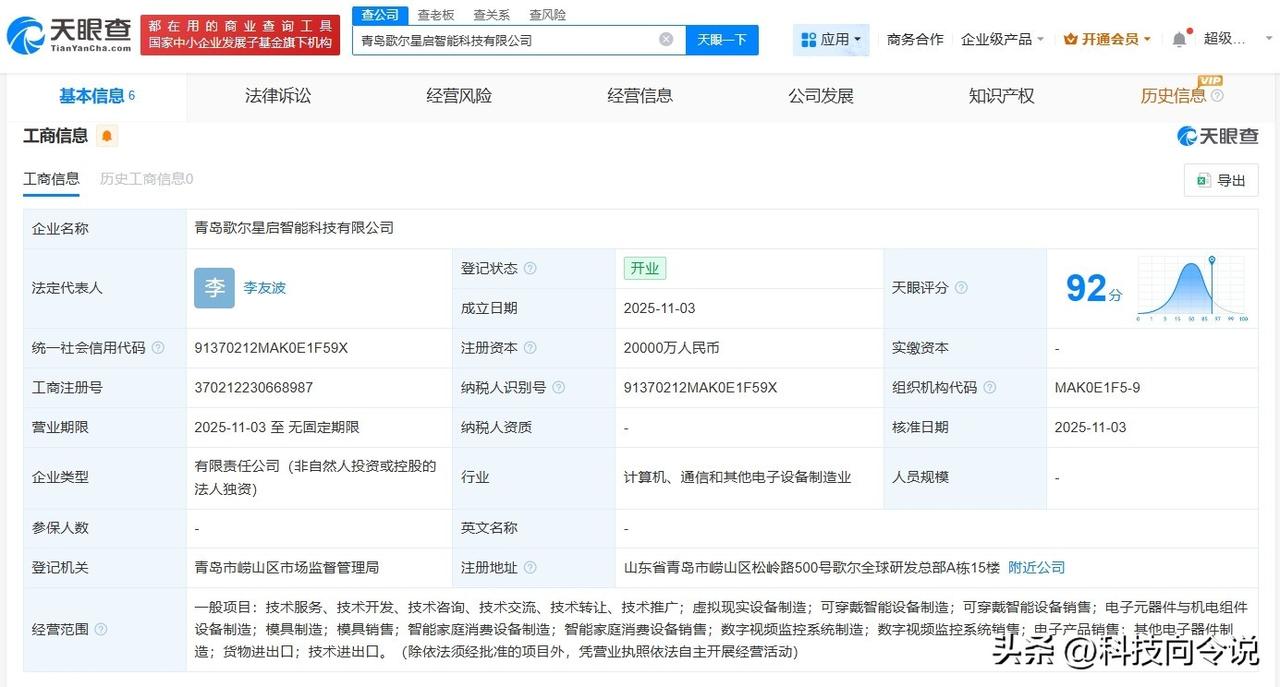 【歌尔股份在青岛成立智能科技公司 注册资本2亿】 天眼查App显示,近日,青岛歌尔星启智能科技有限公司成立,法定代表人为李友波,注册资本2亿人民币,经营范围包括虚拟现实设备制造、可穿戴智能设备制造、智能家庭消费设备制造等。股东信息显示,该公司由歌尔股份(002241)全资持股。 天眼查信息:
