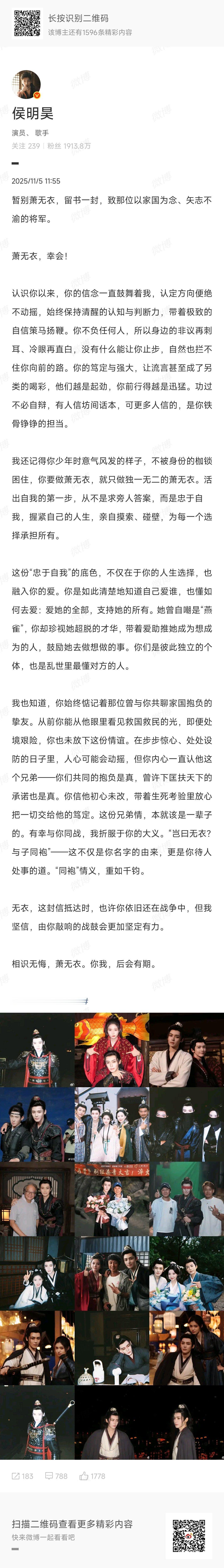 侯明昊长文暂别萧无衣侯明昊长文暂别萧无衣,恭喜侯明昊解锁新角色