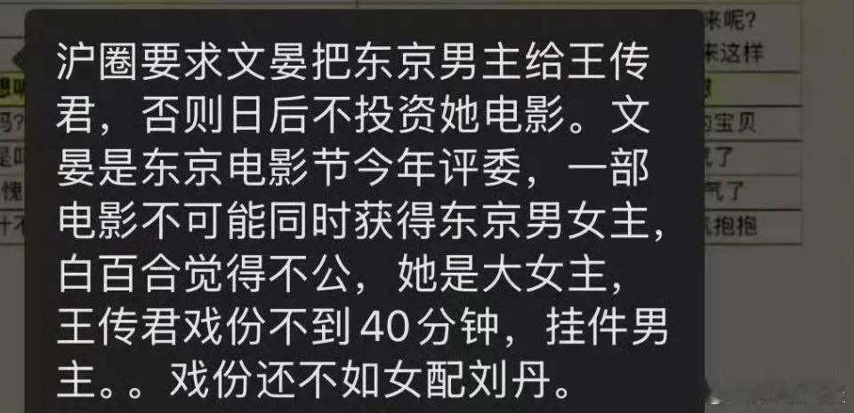 王传君 白百何和王传君这事,着实令人胆寒。真可谓不深挖不知晓,原来此事内幕竟如此深邃。 据知情人爆料,原本在电影《春树》里,白百何是大一番女主。如今这部电影入围了东京国际电影节,她也有意凭借此片拿奖翻身。 谁承想半道杀出个王传君,网传幕后资本沪圈要把男主奖项颁给他。可他在这部电影里仅是个配角,戏份比女配刘丹还少,这岂不是虚假男主?这又如何能拿奖呢? 怪不得白百何忍不住发微博、发朋友圈内涵他们。明明她付出最多,海报上也醒目地写着她的名字,结果最后竟有黑幕,功劳被人抢走。倘若这是真的,换做谁都咽不下这口气吧?