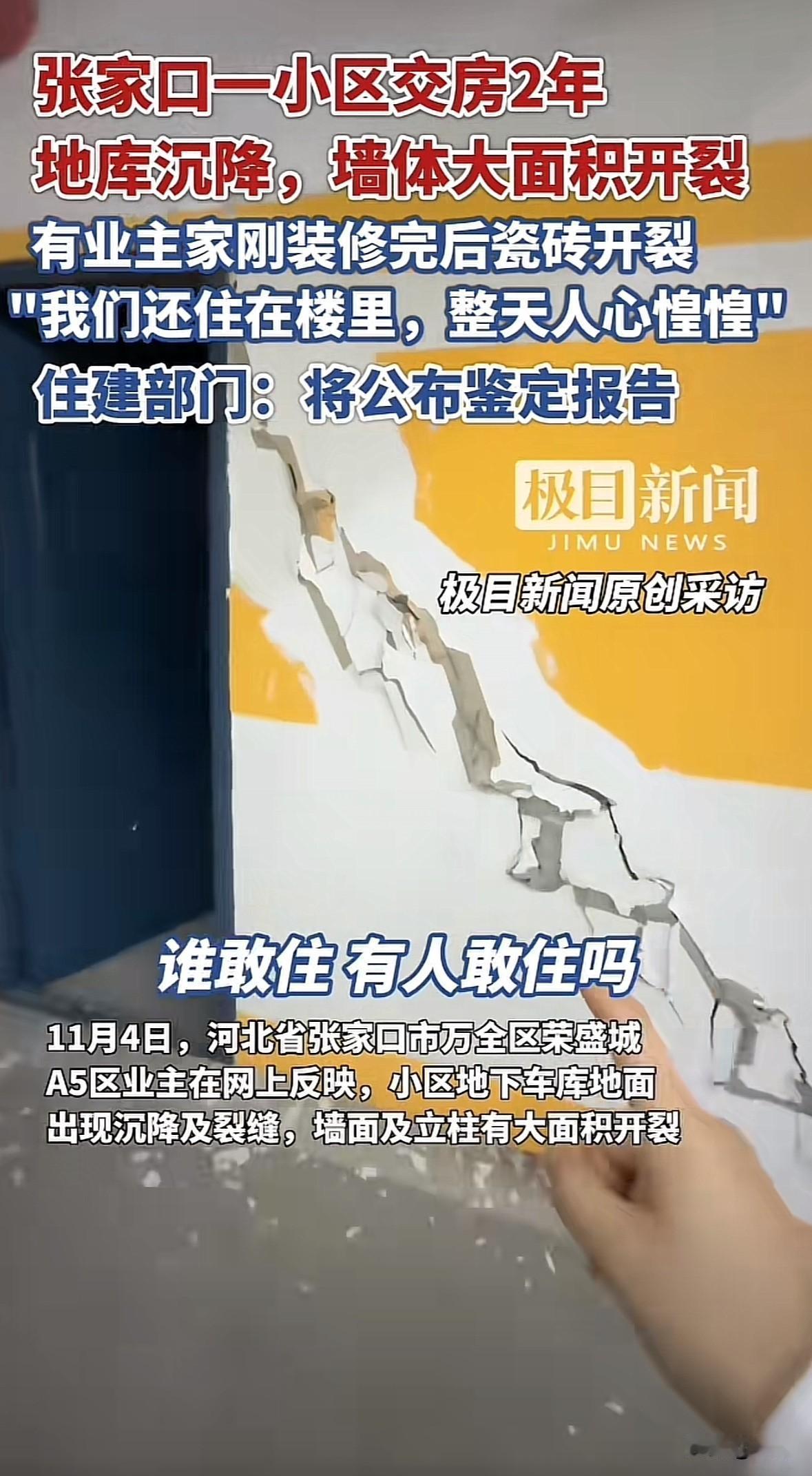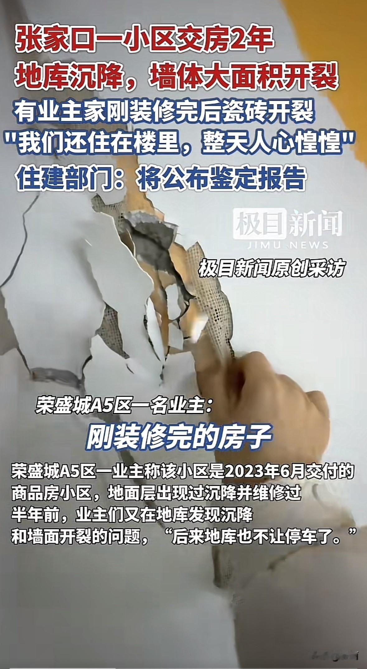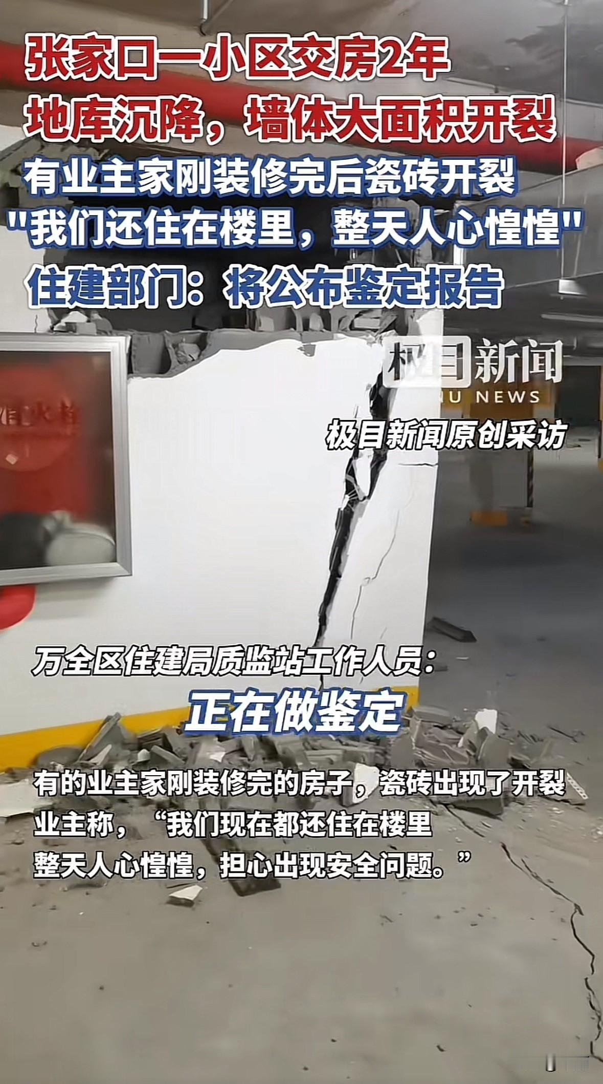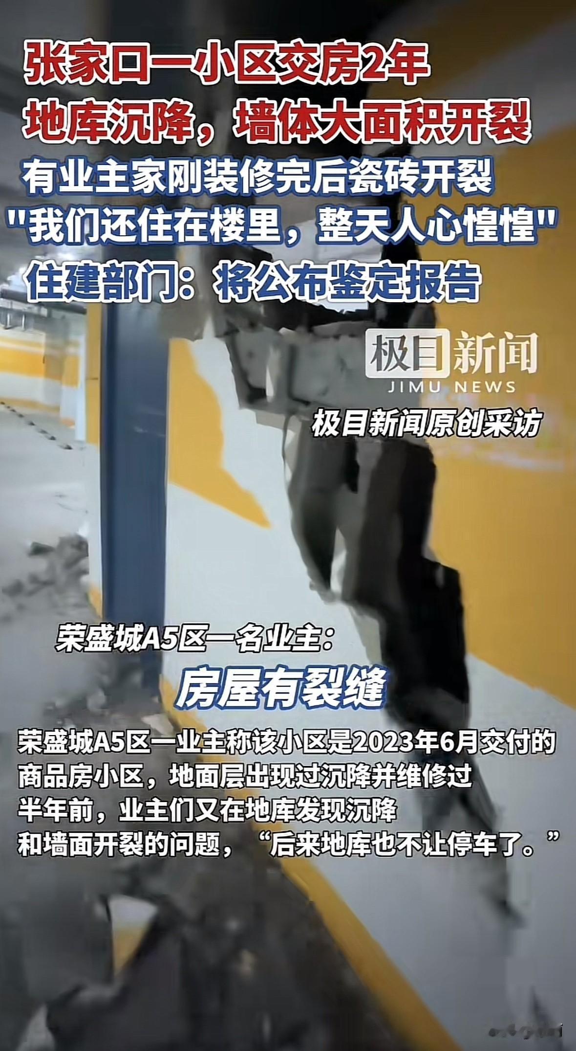 张家口万全区荣盛城A5区2023年交房,现在地库出现沉降开裂。业主说9号楼地库地面裂缝蔓延,墙面补了又裂,柱子也有裂缝,刚装修的房子瓷砖都坏了,住着提心吊胆。 开发商涉及多起司法案件,被执行金额超9000万。业主反映问题好几个月,直到最近才引发关注。 住建局说3月就去过现场,现在第三方机构在做鉴定,近三天出结果。房子是大事,质量不能含糊。希望鉴定结果真实公正,该整改整改,该赔偿赔偿。也得查查当初怎么通过验收的,别让业主住得不安心,保障住房安全才是最基本的。