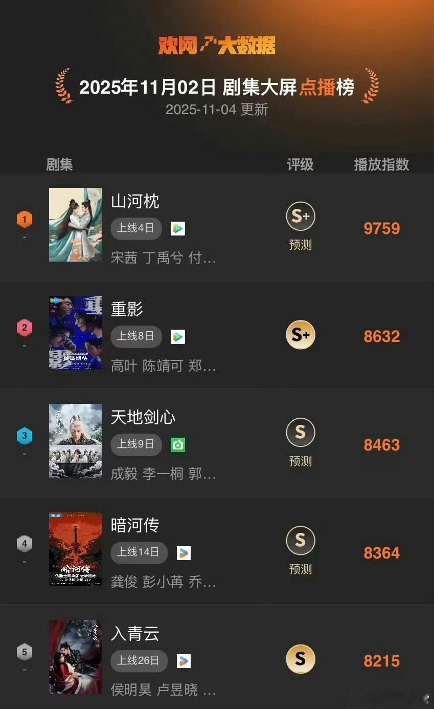 宋茜[超话] 欢网数据——11月2日剧集大屏点播播放指数榜