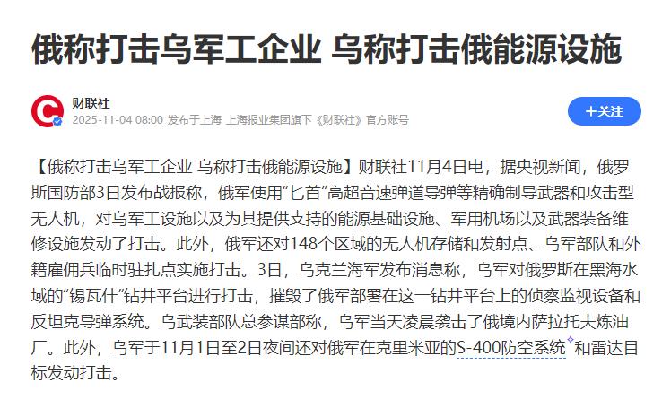 俄罗斯和乌克兰宣布了! 2025年11月4日,俄罗斯国防部发布战报称,使用“匕首”高超音速导弹等精确制导武器,对乌克兰军工设施及其能源基础设施、军用机场等目标发动了打击,同时针对148个区域的无人机存储发射点及外国雇佣兵驻扎点进行了攻击。 先说说这打头阵的“匕首”导弹,真不是中看不中用的花架子。速度能飙到10倍音速,乌克兰的防空系统压根反应不过来;打击精度能控制在10米以内,指哪打哪绝不含糊,2000公里内的目标都跑不掉。 早在2022年,它就第一次在乌克兰战场亮相,直接炸了个大型弹药库,从那以后就成了俄军敲碎关键目标的撒手锏。这次特意用它开道,就是吃准了乌克兰拦不住、防不了,一出手就往最痛的地方戳。 军工设施是乌克兰造炮弹、导弹的根儿,能源设施就是前线部队运转的命脉,这俩地方一被炸,补给线等于直接被掐死。现在乌克兰军队的炮弹、导弹,不少都得靠本土工厂临时凑数,可生产线一毁,就算西方的援助能及时送过来,没地方分装、调试也白搭。 更要命的是没了电,军工车间开不了工,军用机场的雷达转不起来,连坦克、装甲车的油料都没法保障,前线部队直接陷入了有兵没粮的窘境。 148个无人机窝点和外国雇佣兵的驻扎地,这数字准得邪乎,显然俄军把乌军的底牌摸得门儿清。无人机现在是乌军反击的主力,一天能扔120架出去搞偷袭、炸装甲目标,全靠这些存放点不停补给。 现在老窝被一锅端,接下来拿什么跟俄军耗?那些外国雇佣兵更不用提,本来就是乌军的外援骨干,驻扎点被精准打击,不光是减人那么简单,更把西方“志愿支援”的底气戳破了,乌军的士气先泄了一半。 俄军这波打击的心思明明白白,就是不给乌克兰喘气的机会。之前乌军还能靠零散的军工产能凑点弹药,用无人机打游击拖时间,靠雇佣兵撑场面。现在俄军一出手就断了这些活路,等于直接给乌克兰的战争机器拔了电源。 要知道,“匕首”这种级别的武器,俄军不会随便用,一旦派上用场就奔着一锤定音来的。从2024年开始,俄军就好几次用它炸乌克兰的关键设施,每次都让乌军的后勤和生产陷入瘫痪。这次更是集中火力,把军工、能源、无人机、雇佣兵这些核心节点全打了一遍,就是要彻底打散乌克兰的抵抗能力。 接下来的局面不难猜,乌军要么等着西方紧急送援助填窟窿,要么就得收缩防线被动挨揍。可西方援助再快,也赶不上战场的消耗速度,更何况“匕首”导弹随时可能再来一轮。俄军就靠这种精准打击,掐断了乌克兰打下去的底气,这波操作下来,战场的主动权妥妥攥在了自己手里。