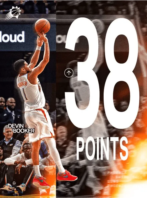 NBA常规赛,太阳107-118不敌勇士。 本场比赛,太阳球员德文-布克出战39分钟,得到38分3篮板4助攻。 赛后,太阳官方发布布克得分海报,并配文道:“布克今晚斩获赛季新高的38分,这是他在本赛季前8场比赛中,第六次单场得分30+。”