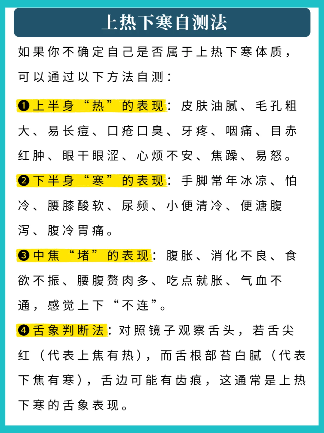 如果你不确定自己是否属于上热下寒体质,可以通过以下方法自测:
