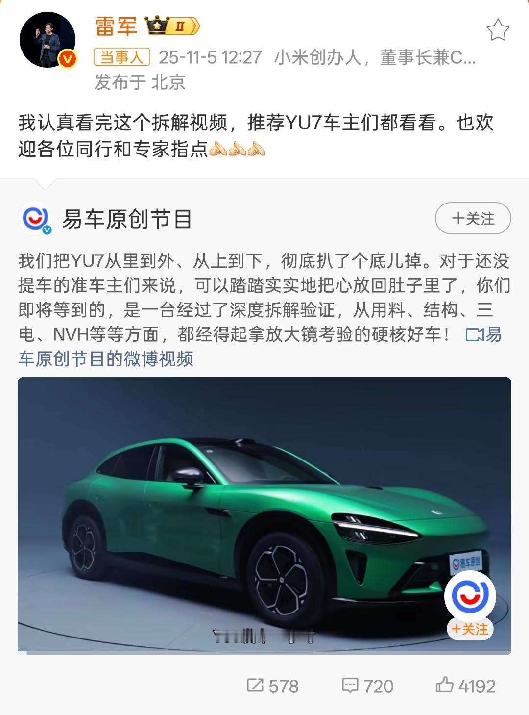 雷军回应小米YU7首拆视频关键时候还得需要一些真材实料亮出来,直接拆解看看小米对安全的用料,也不讲虚的。视频很全面,也很专业,想要了解的真心可以去看看……