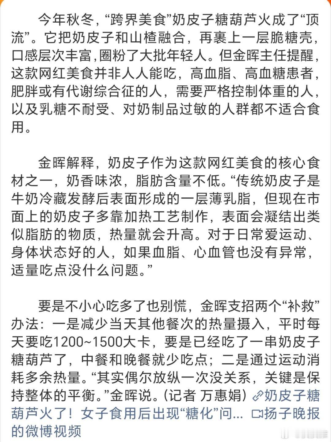 第一批奶皮子糖葫芦受害者现身现在很多网红食品都是热量严重超标的,偶尔吃一次问题不大,如果经常吃,可能会吃出亚健康。