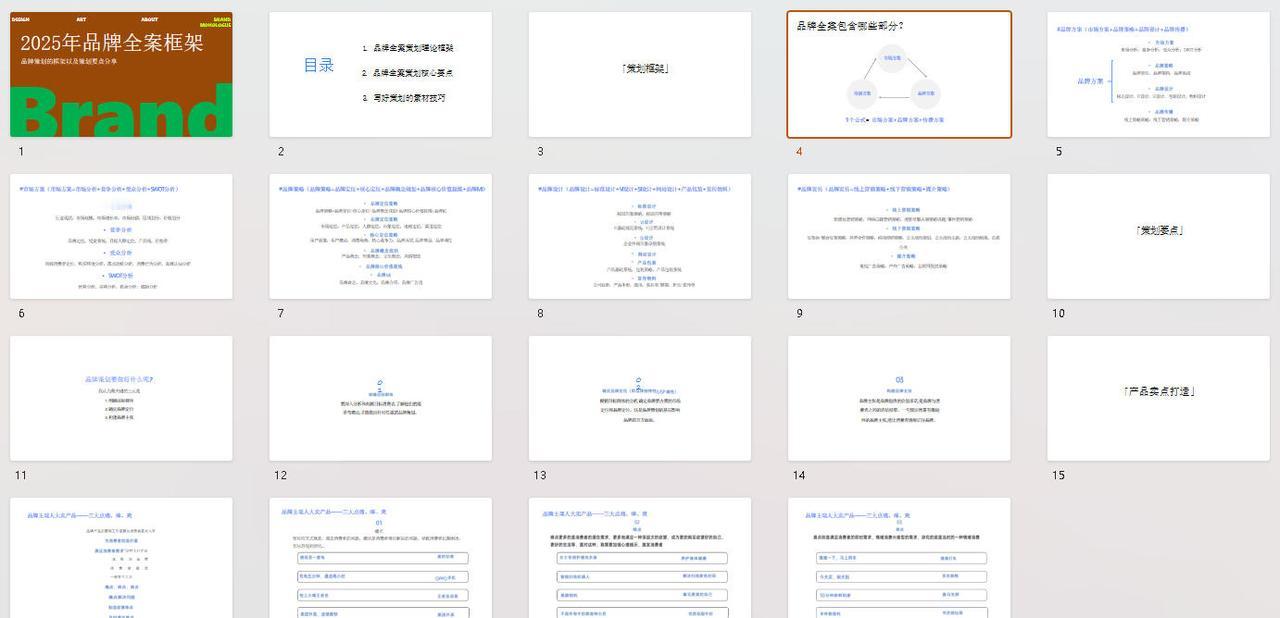 【干货分享】2025年品牌全案框架-PPT 系统思维整合定位、视觉、传播等核心模块,通过精准市场分析明确差异化优势,避免品牌在同质化竞争中迷失。其能规范全渠道品牌形象与体验一致性,降低消费者认知成本,强化信任与忠诚度。更适配 2025 年精准化、可量化营销需求,明确资源分配与转化路径,让每笔投入可追溯,同时为应对市场变化提供迭代框架,是品牌积累资产、实现可持续发展的关键保障。
