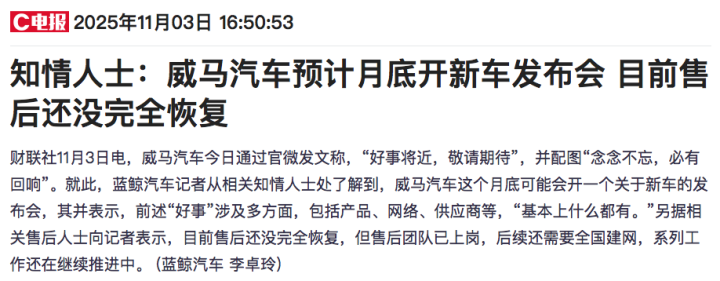 还有媒体报道称,其从知情人士那儿了解到,威马这个月底可能会开一场新车发布会。这位知情人士还说,之前提到的“好事”涉及挺多方面,像产品、网络、供应商这些,“基本上啥都有”。还有负责售后的人透露,现在售后还没完全恢复,但售后团队已经上岗了,接下来还要在全国建售后网点,这些工作都在慢慢推进。