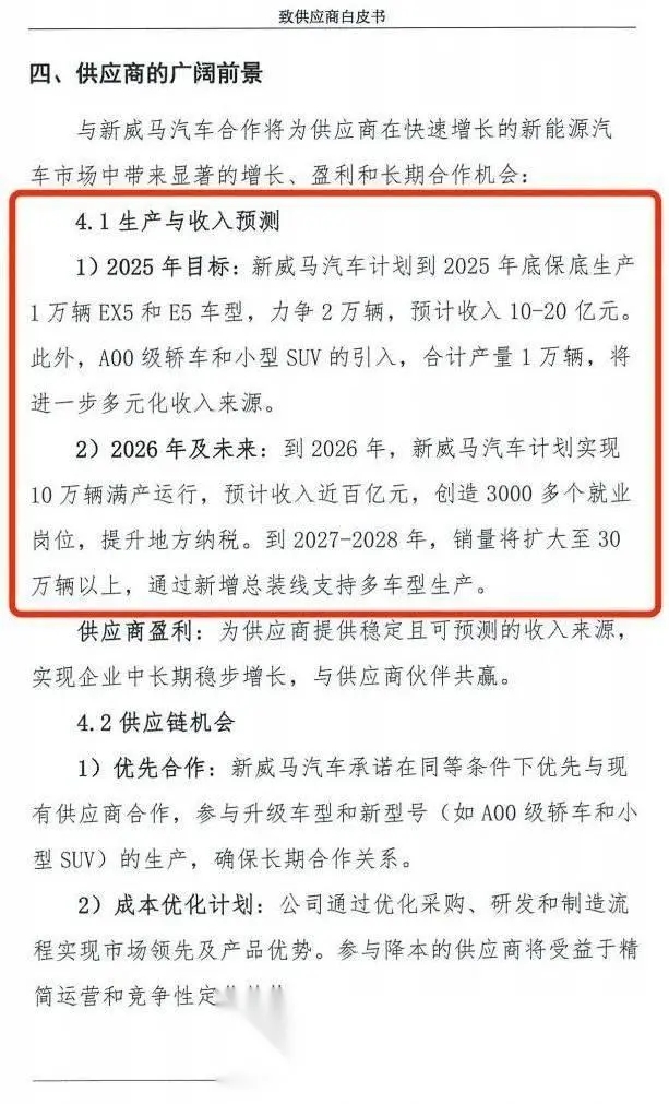 但这份规划刚出来,就遭到了业内人士的质疑。因为威马的复工“路线图”实在有点“激进”,今年9月先恢复EX5、E5两款老车的生产,目标年产1万-2万辆;2026年要把产能提到10万辆;到2030年,直接冲百万辆规模,还要实现1200亿元营收。