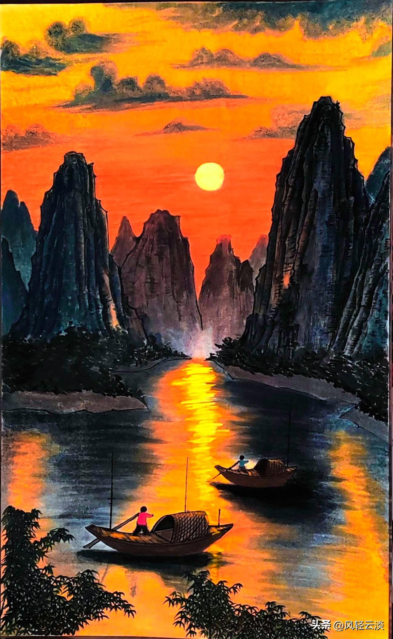 笔记:我学国画画的《渔舟唱晚》 铺展宣纸时,满脑子都是课本里“江枫渔火”的调子——索性把晚霞调得比真实更烈些,橘红裹着橙黄,往天际泼开,连山尖都浸在暖光里。 峰是照着桂林的模样勾的,硬挺的皴法混了点写意的软,墨色沉下去时,倒真有了“拔地而起”的骨感。江面的金波是最难的,调了藤黄兑赭石,一笔笔扫出粼粼的光,偏生渔船的影子要压得暗,才衬得出这天地的亮。 最贪的是那抹红衫——渔人的衣襟蘸了朱砂,在暮色里像粒火苗。搁笔时窗外刚落黄昏,画里的船还在波心荡,倒像把眼前的晚风吹进了宣纸上。 原来国画不是“像”,是把眼里的暖、心里的静,都揉进墨色里。