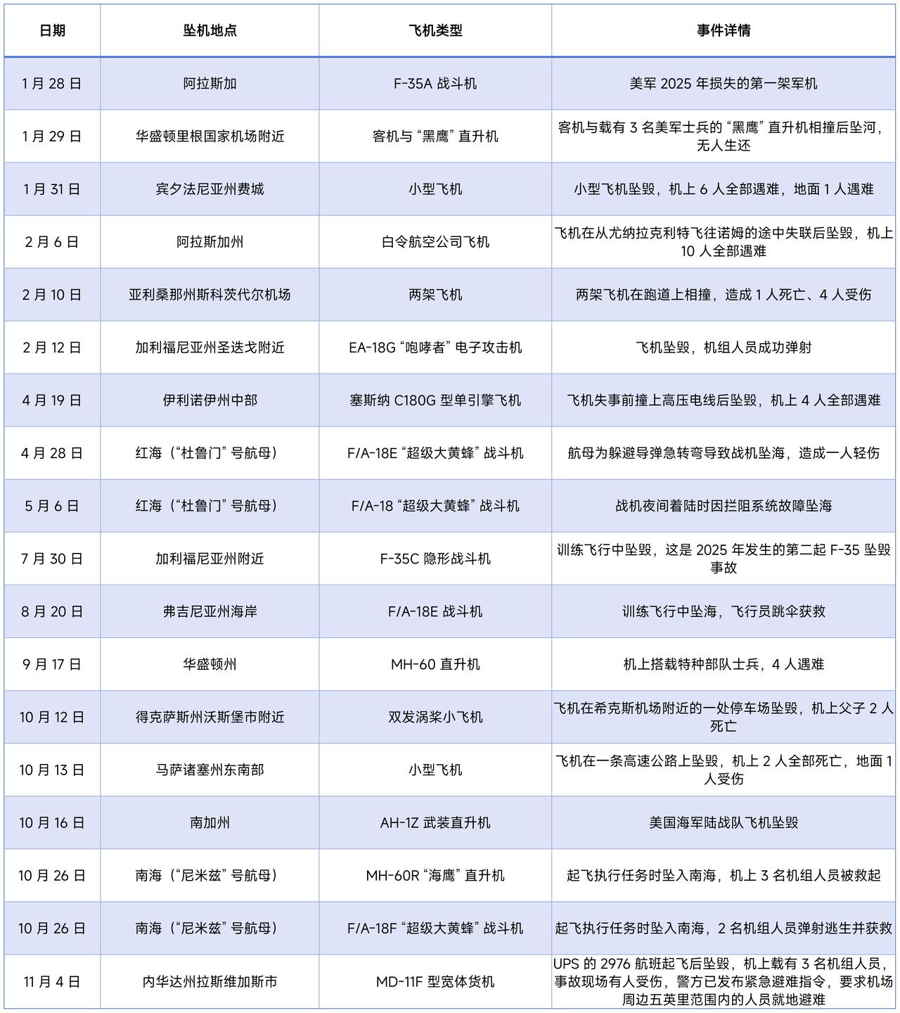 不数不知道,一数吓一跳。看看这份“美国坠机大事纪2025版”,今年11月刚开头,