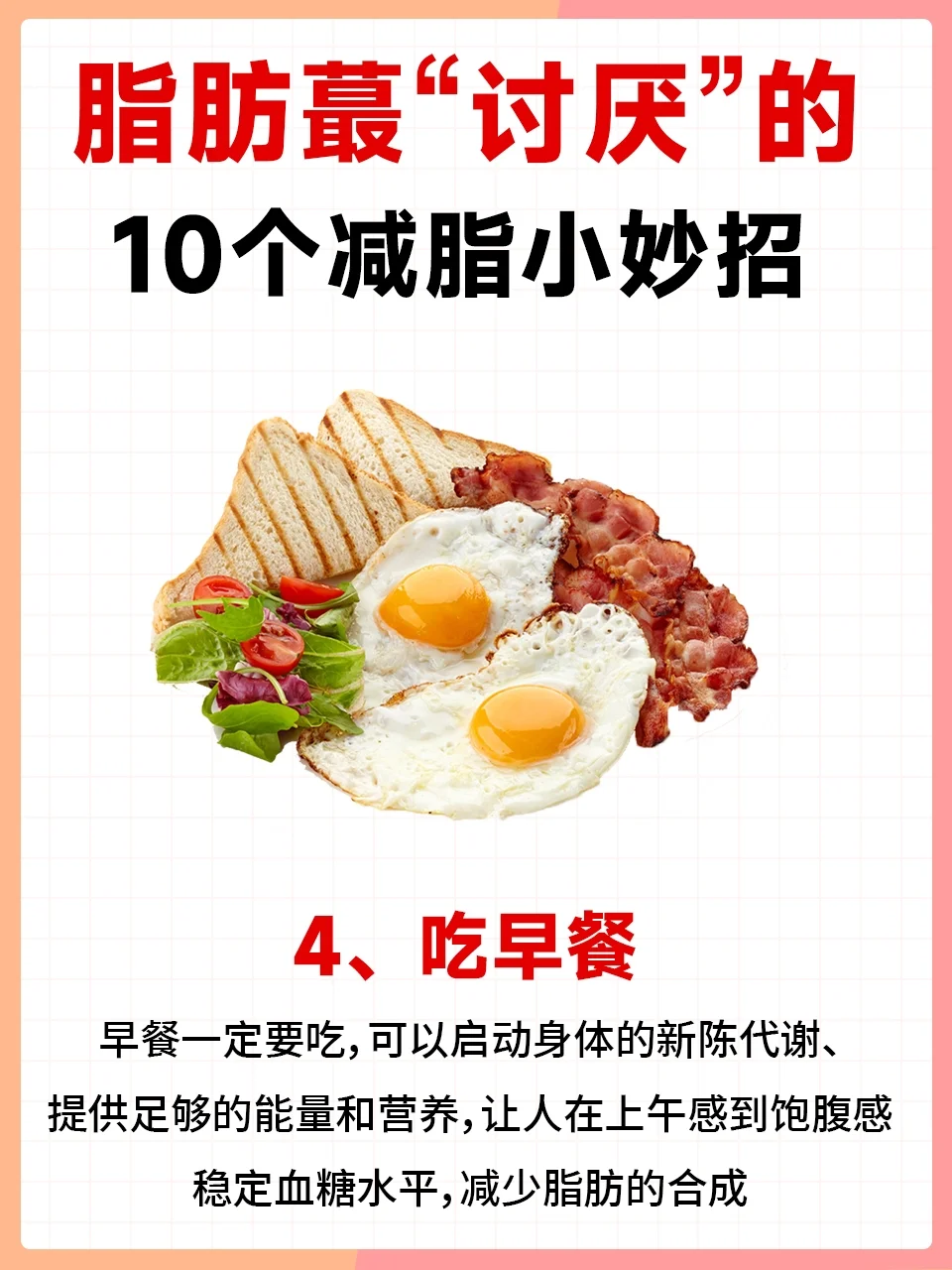 减脂就是要做脂肪“讨厌”的事~ 今天给大家分享🔟个减脂小妙招 1⃣多睡觉 2⃣多吃优质蛋白 3⃣空腹运动 4⃣吃早餐 5⃣多喝水 6⃣不久坐 7⃣吃饭细嚼慢咽 8⃣喝茶、黑咖啡☕️ 9⃣睡前保持饥饿感 🔟睡前泡脚 需要的宝子码住,坚持下来会有收获的
