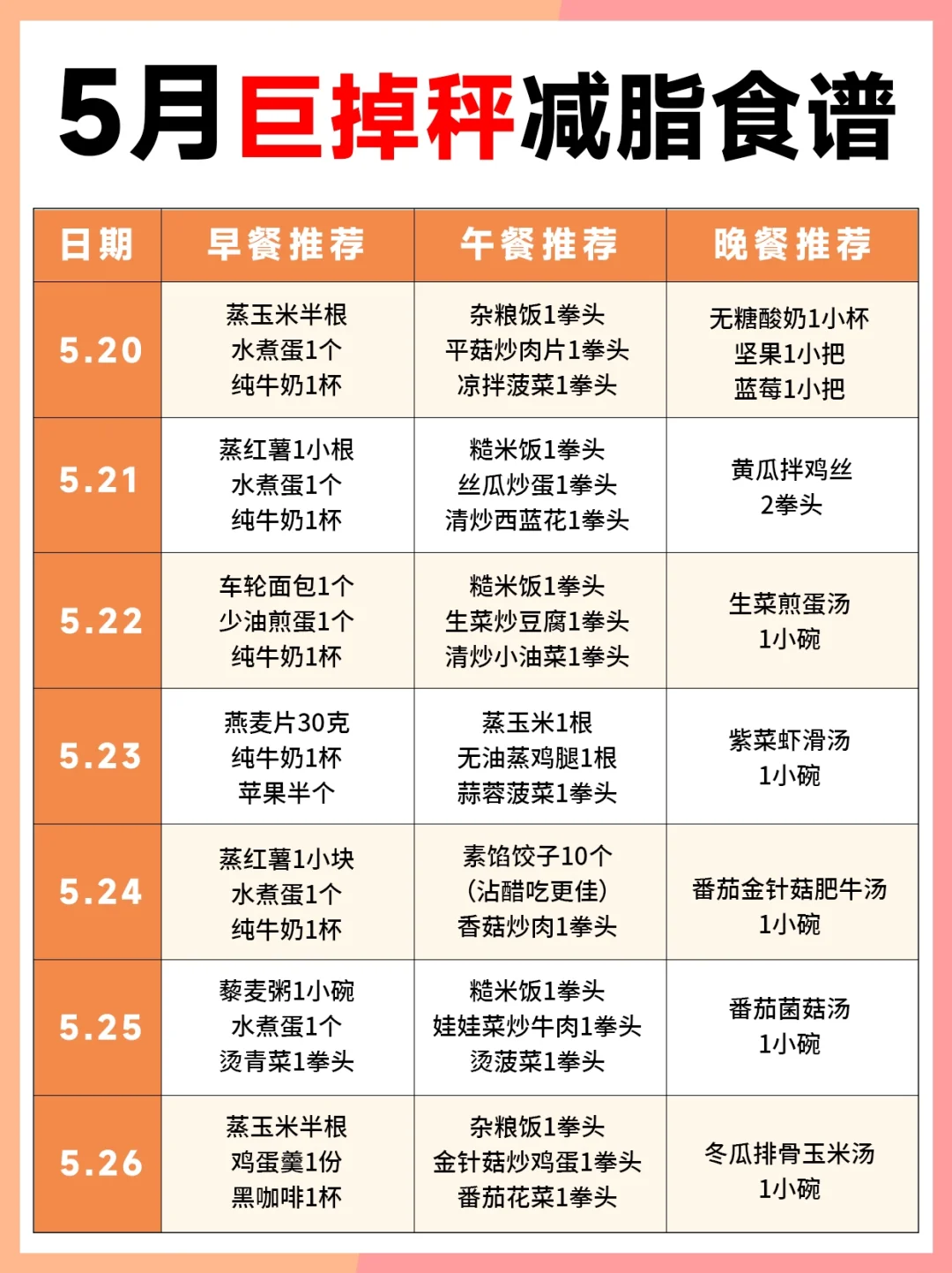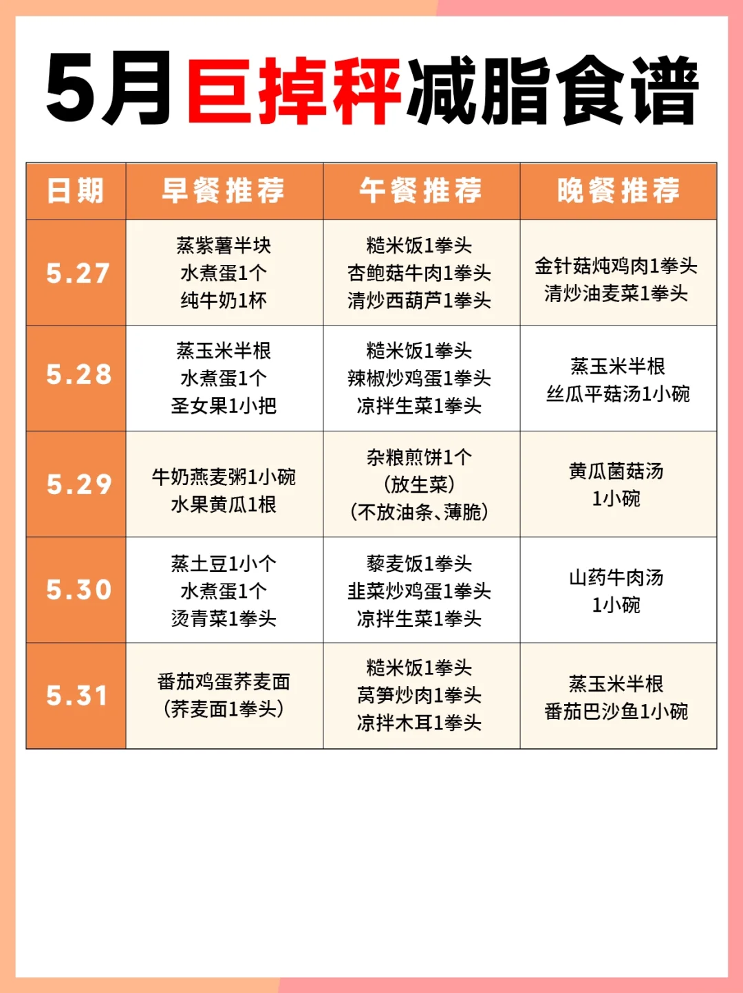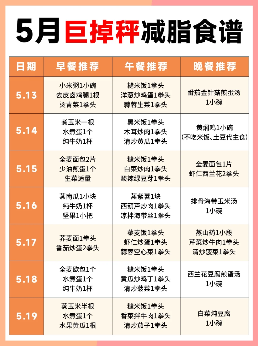 五一假期结束啦,体重秤上的数字是不是又变大了[偷笑R] 今天给大家整理了5⃣月减脂食谱 快照着吃起来吧~ 不然真的要跟小裙子👗无缘了 (食谱不包含五一假期期间)