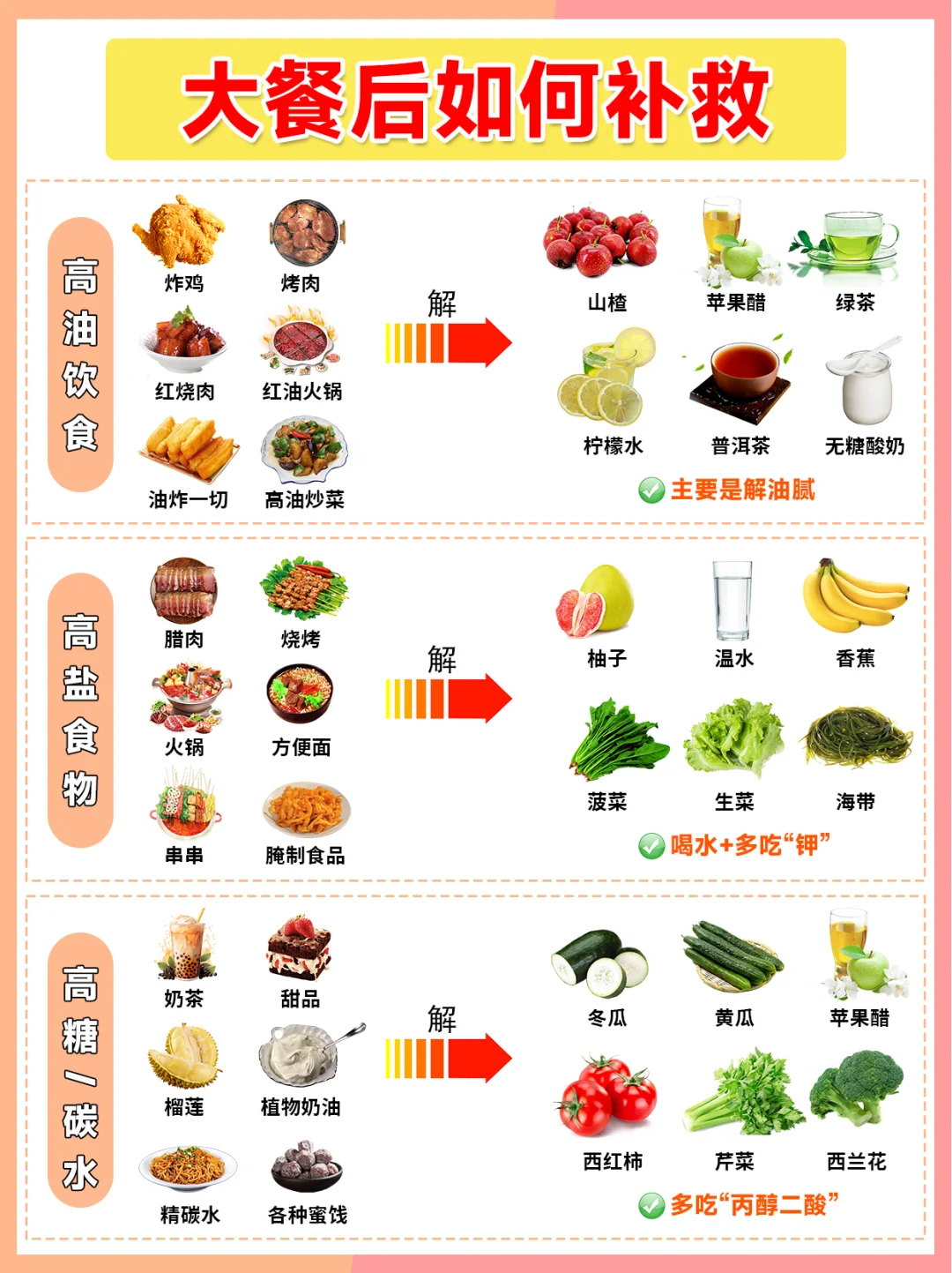 1⃣高油饮食补救:可以吃一下山楂、苹果醋,绿茶、柠檬水等,对冲“油腻感”