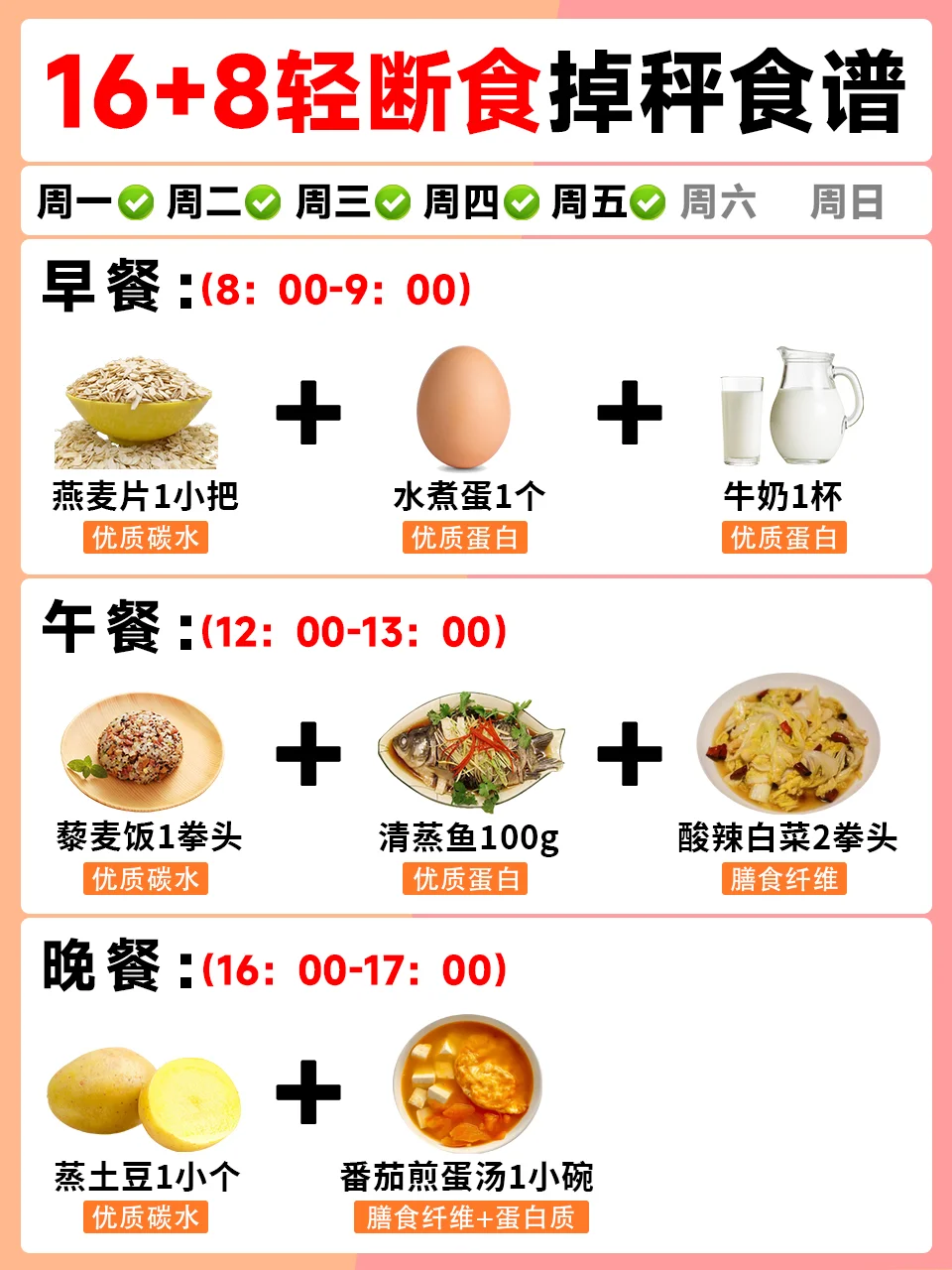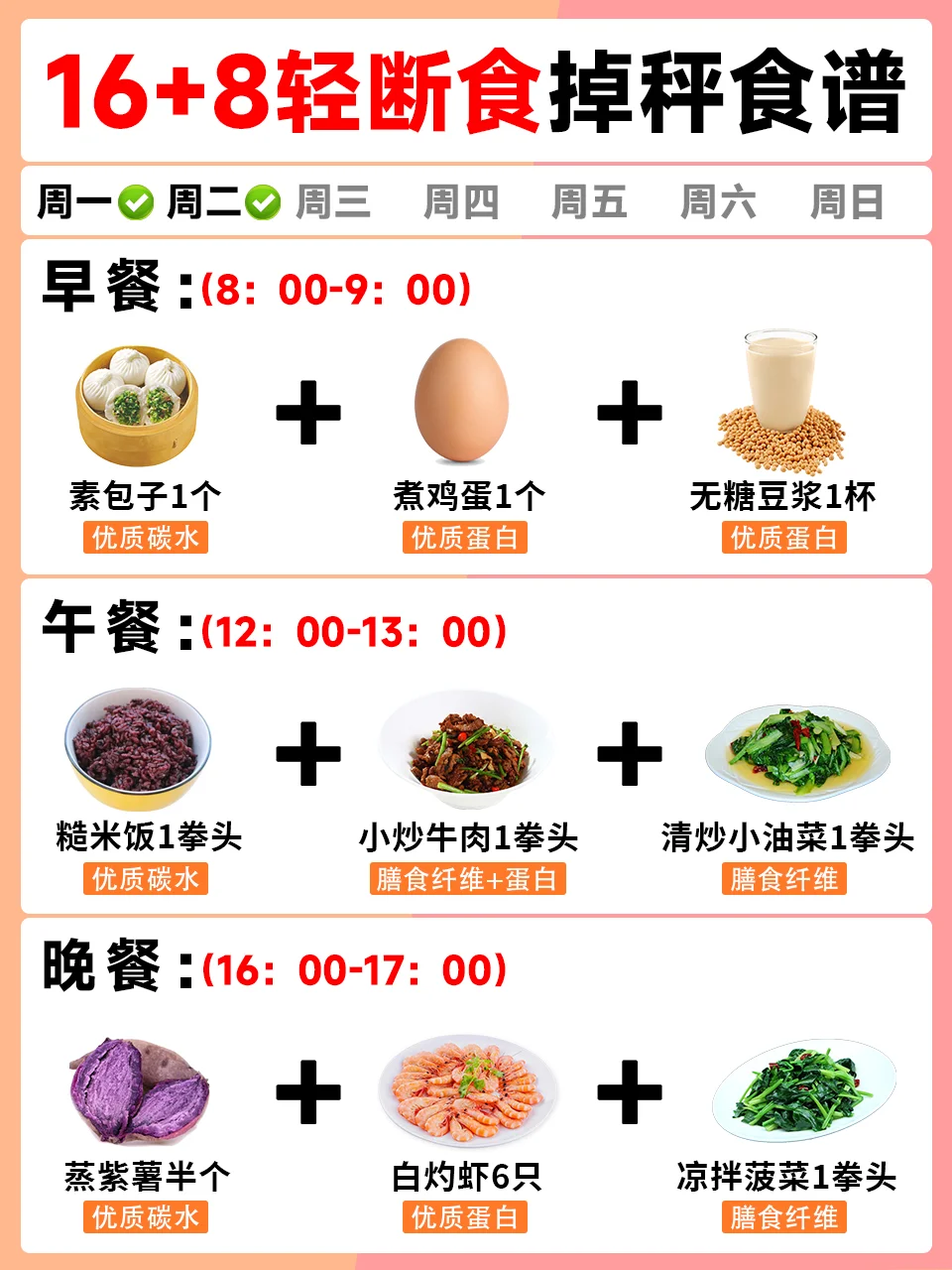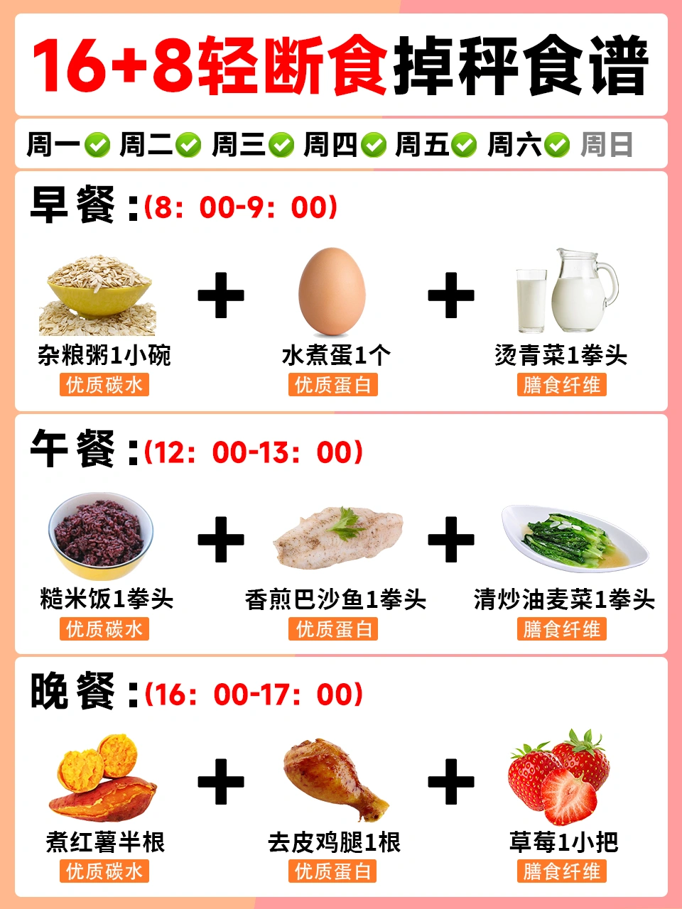 简单来说,就是把每天的进食时间控制在 8 小时内,其余 16 小时禁食,可以喝水。再搭配上这份食谱,效果直接拉满🈵
