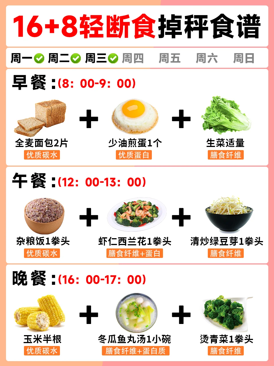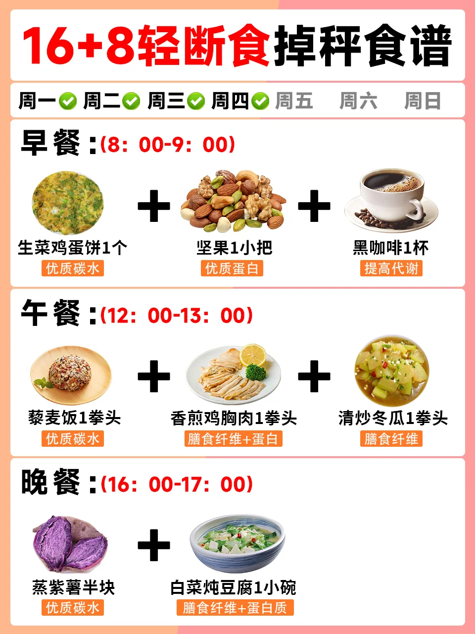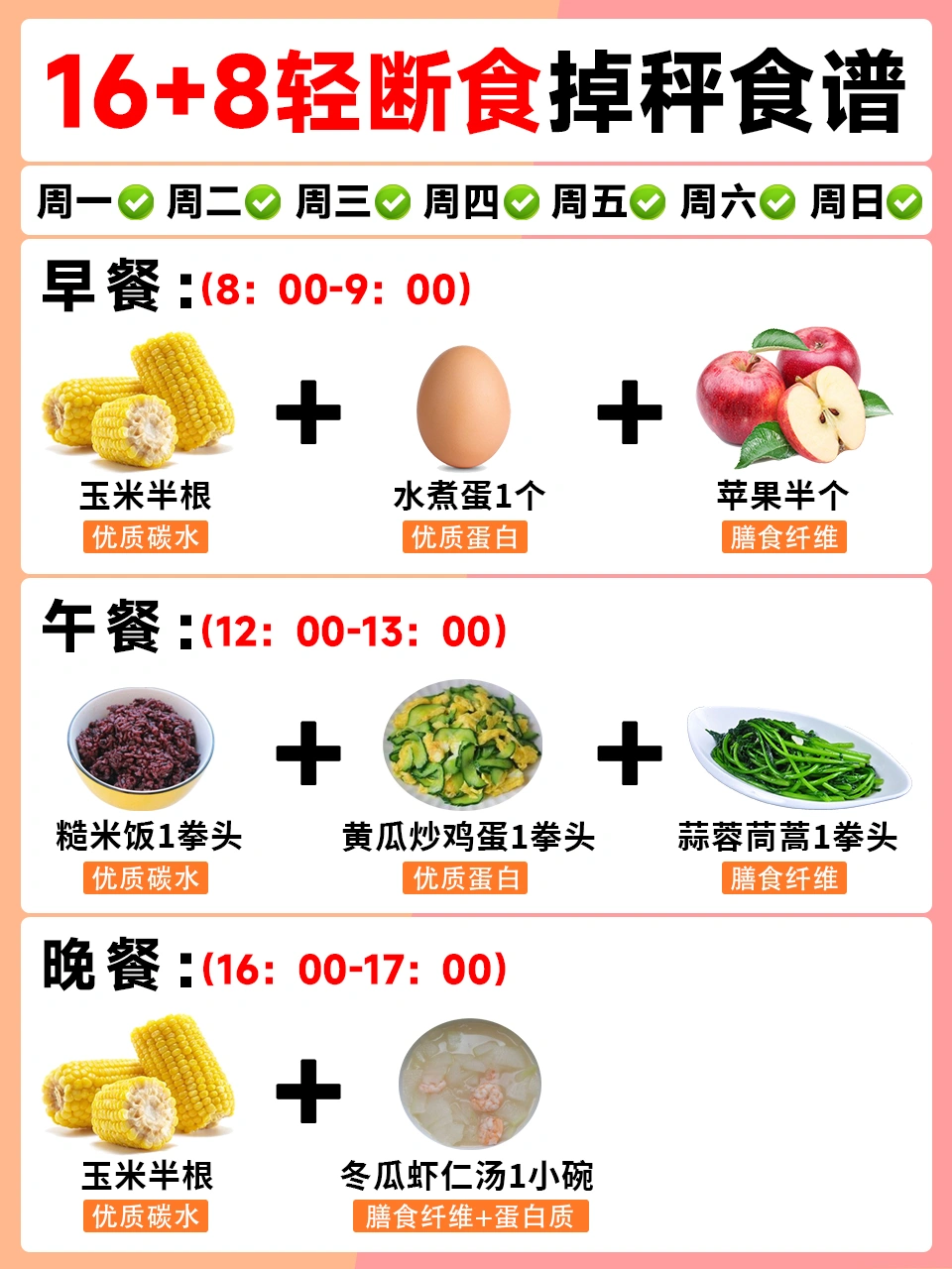 简单来说,就是把每天的进食时间控制在 8 小时内,其余 16 小时禁食,可以喝水。再搭配上这份食谱,效果直接拉满🈵