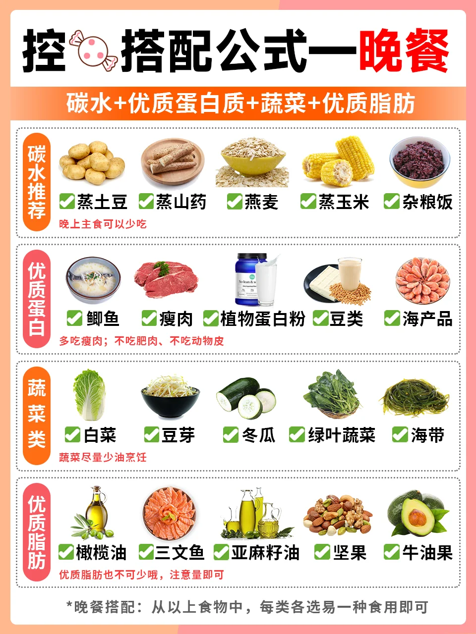 3⃣晚餐:优质碳水 + 优质蛋白 +膳食纤维+优质脂肪
