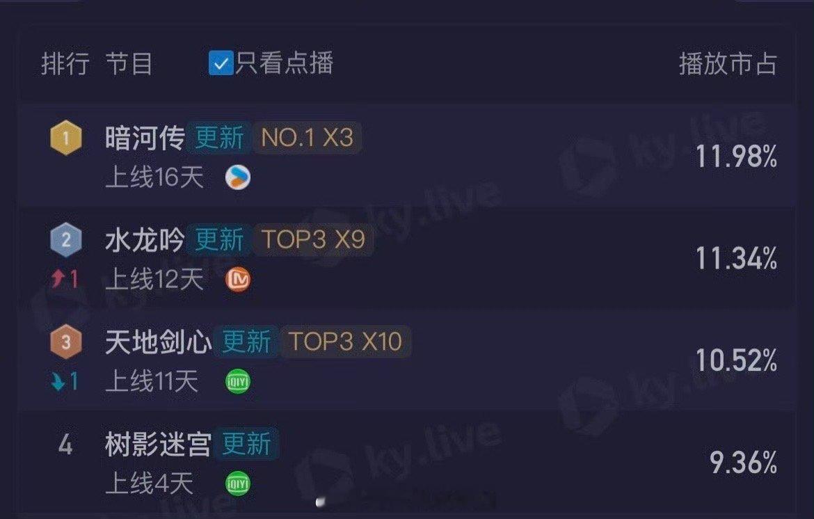11月3日云合播放占比云合天地剑心11.8%暗河传11.5%水龙吟9.3%入青