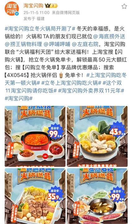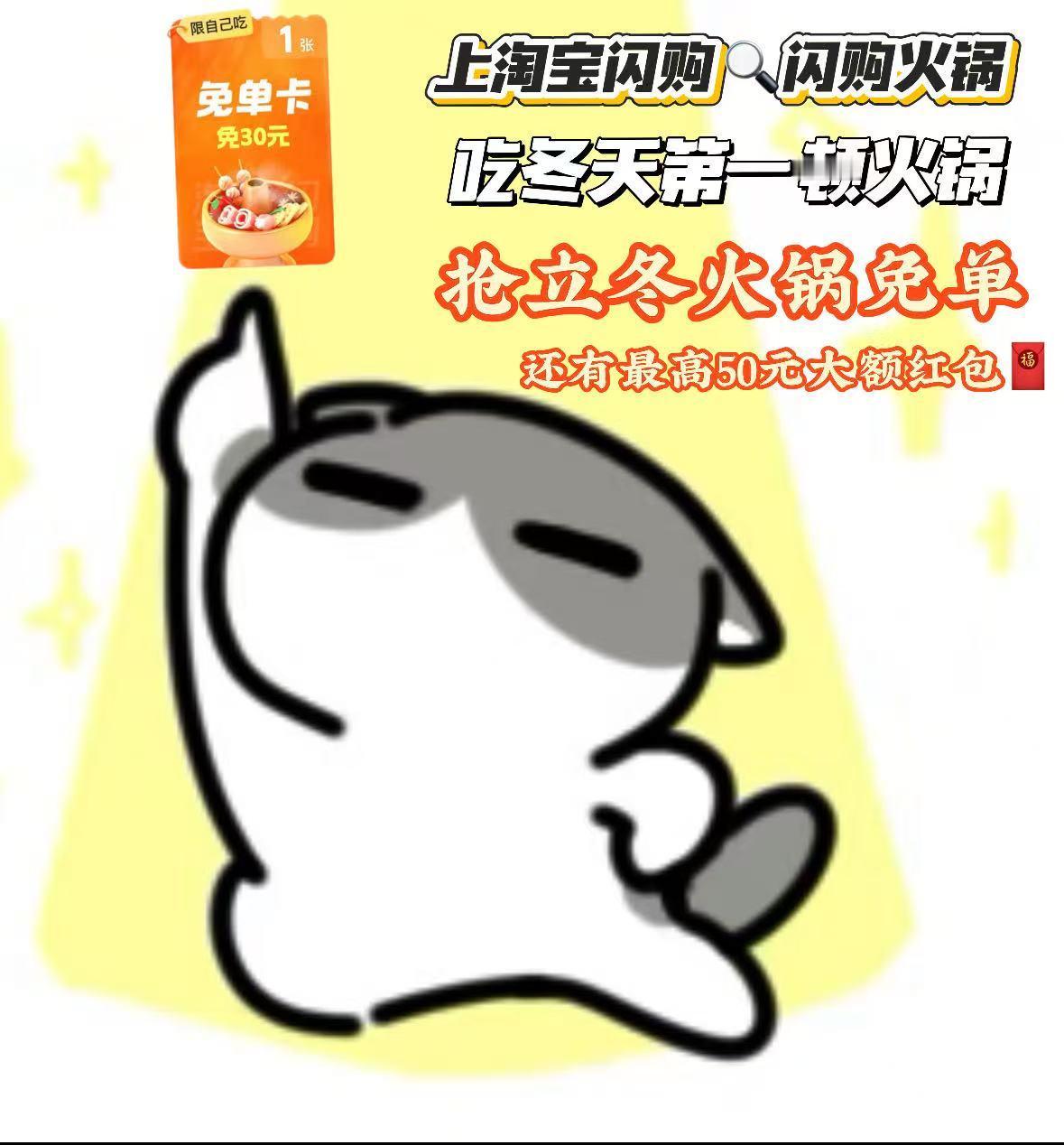 入冬仪式感有!淘宝闪购带着火锅天团在这个冬天送温暖了[哇]上淘宝闪购吃冬天第一顿火锅 寒风起,宜进补!淘宝闪购让你暖心更暖胃,上淘宝搜索【闪购火锅】,火锅免单卡等你来抢,进入立冬会场更有机会领取最高50元大额红包,滋补暖冬就此开启!淘宝闪购立冬火锅局开涮了 淘宝闪购外卖界双11元年