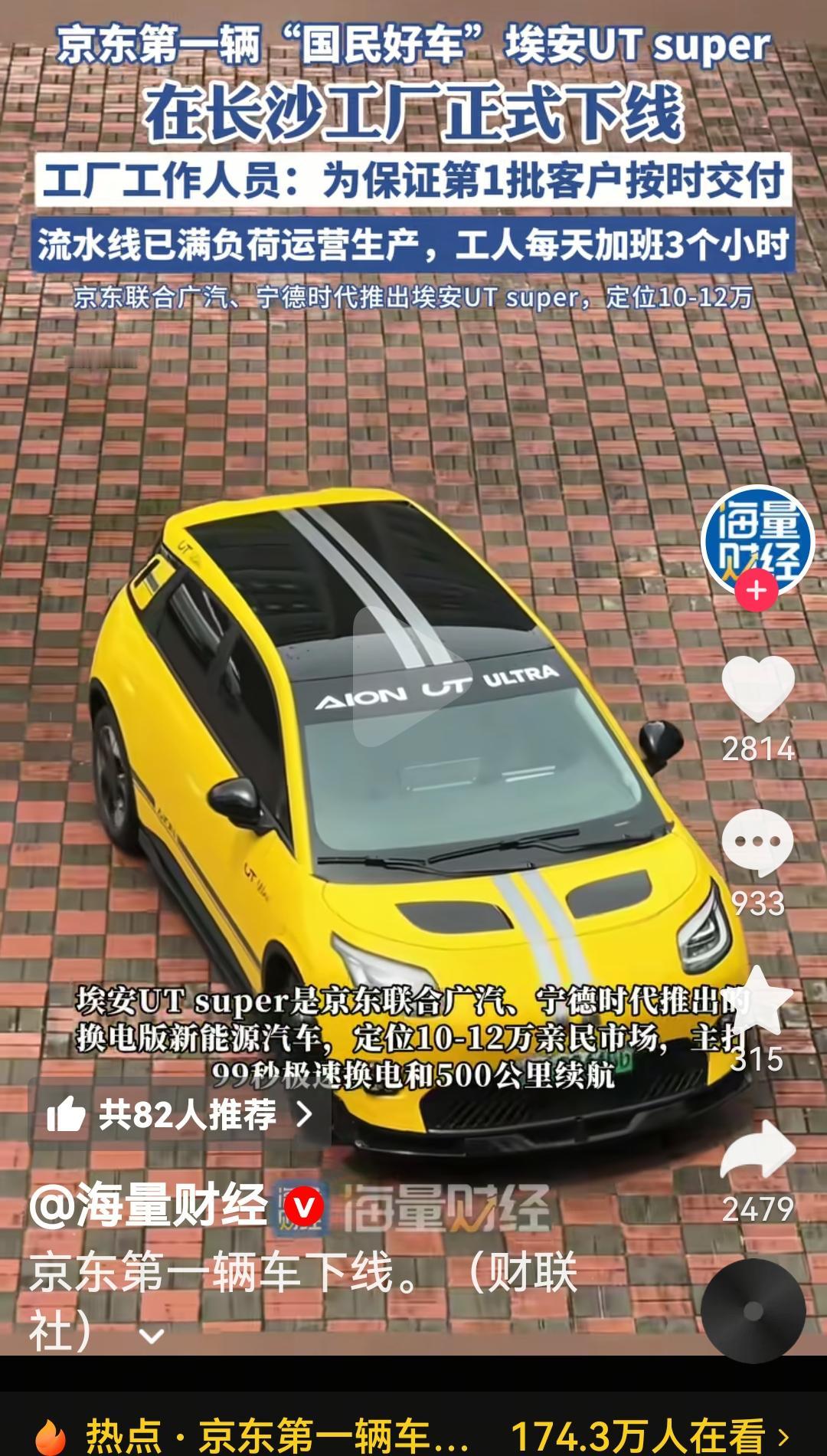京东和广汽合作的第一辆车在长沙工厂下线 名字埃安UTsuper, 这款车是京东联合广汽,宁德时代推出的 价格是10到12万 感觉价格还可以,今天突然看到比亚迪海鸥迷你版,感觉也挺好看,开车也挺不错 现在的车就像以前手机,座机电话那一会,刚开始感觉牛逼,后来多了也就不稀奇了,能够代步,安全就行了 最好不要上绿化带,最近听说环卫叔叔阿姨都想开始组装新能源汽车了广汽埃安 埃安车 埃安 RT 埃安新车RT 图片来自海量财经视频