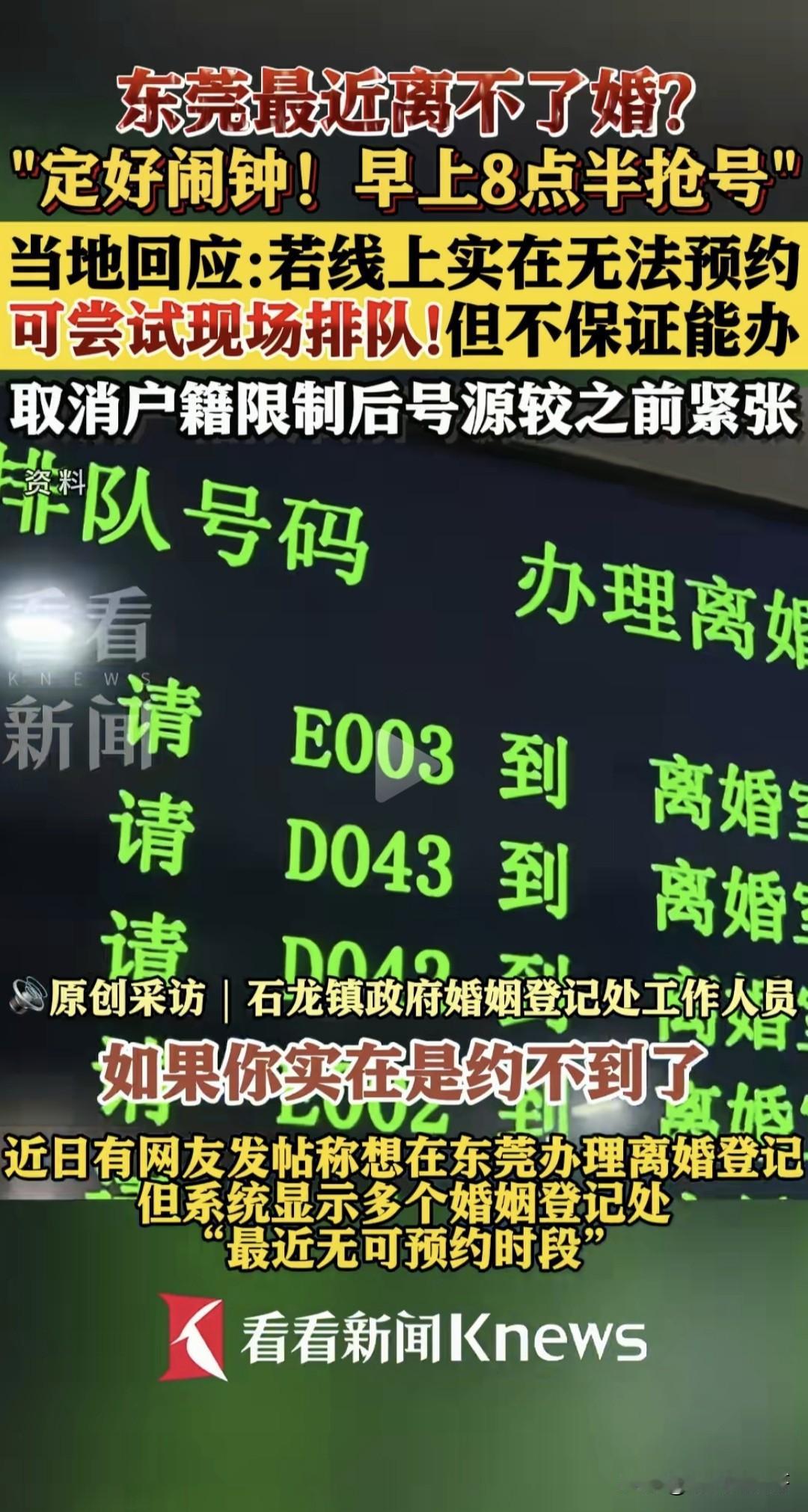 以前买房需要抢号,如今在东莞离个婚都得定闹钟抢号。近日有网友说东莞多个婚姻登记处没可预约时段,引发大量关注。 原来自今年 5 月婚姻登记“全国通办”实施,东莞离婚登记取消户籍限制,外市、外省居民都能预约,号源变得紧张。婚姻登记处工作人员称,每天早上 8 点 30 分固定放号,涵盖未来 15 天的号源,这时段预约成功率高。还能关注非放号时段的退号捡漏,或者选稍远但可约的办理点。 对此,网友质疑婚姻登记处办事效率低下,一天到底能正常办理多少个离婚证,有必要公布一下,毕竟离婚也是老百姓的人生大事,不能因为因为“人数多”就一直让人等下去。