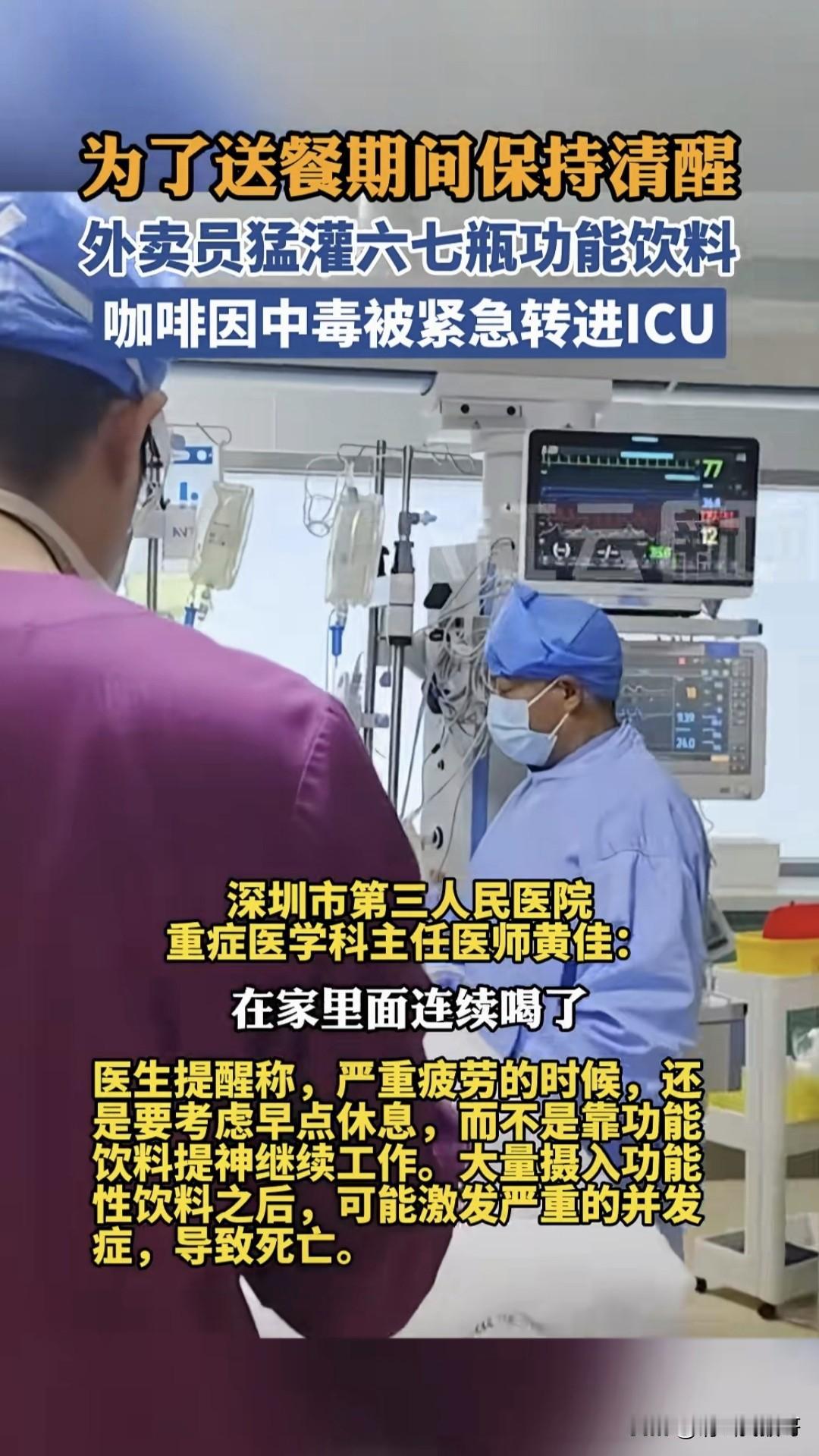深圳一外卖小哥为了在送餐期间保持清醒,一口气灌下六七瓶功能饮料,结果因为咖啡因中毒,如今躺在ICU里面治疗。日常很多开车的朋友为了提神,都喜欢备上几瓶功能饮料,这已经成为司机朋友的一种习惯。但医生提醒,适量的饮用确实有助于提神醒脑,但人在过度疲劳的情况下,首先要考虑是及时休息,而不是依靠功能饮料,过多的摄入可能引发并发症。工作再忙还是要注意身体!