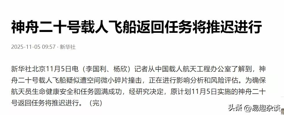 “家人们,航天员今天不回地球了!原因你绝对想不到…” 说好的今天看神舟二十号返回直播,结果官方突然通知:航班延误! 为啥?因为飞船在太空可能被“太空沙尘暴”——也就是微小碎片,给“蹭”了一下。 别慌!这可不是电影里演的那种灾难性撞击,更像是在高速上开车,被一颗极小的石子击中了挡风玻璃。严不严重?得先做个全身“CT”扫描才知道。 咱们中国航天的原则就是:绝不搞“侥幸心理”,必须100%确认安全才让英雄们返航。这波“延迟交付”,换来的可是实打实的“安全到货”! 这才是真正的实力宠航天员!让我们一起耐心等待,给地面工程师们点个赞,期待英雄们最稳妥的回家之路!