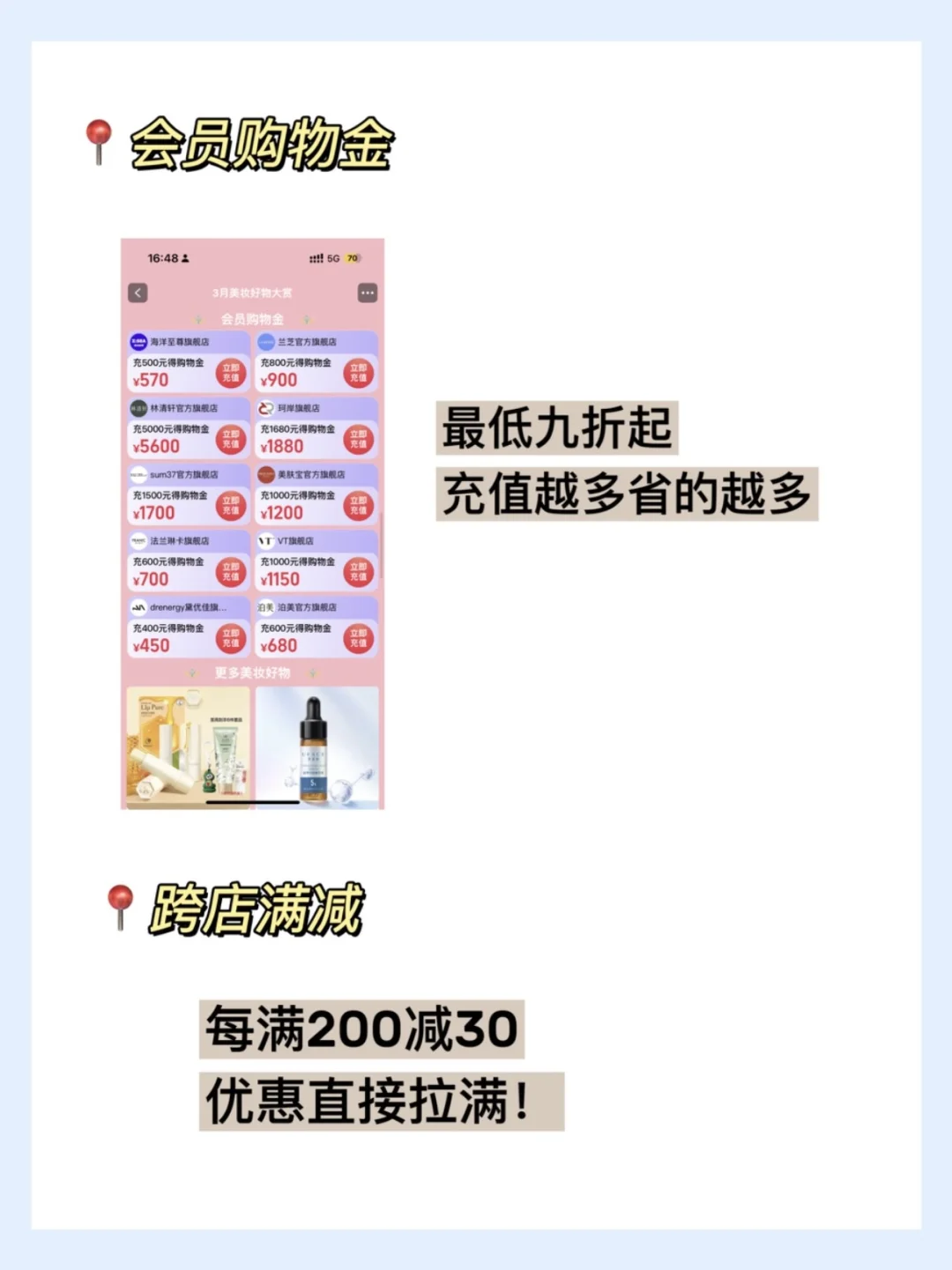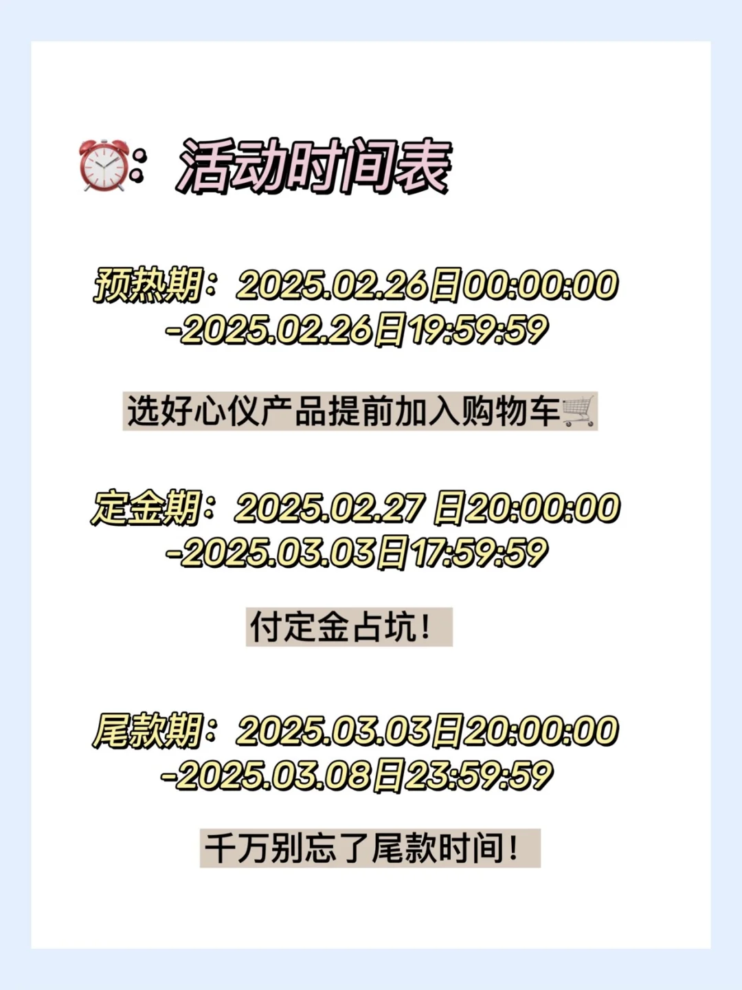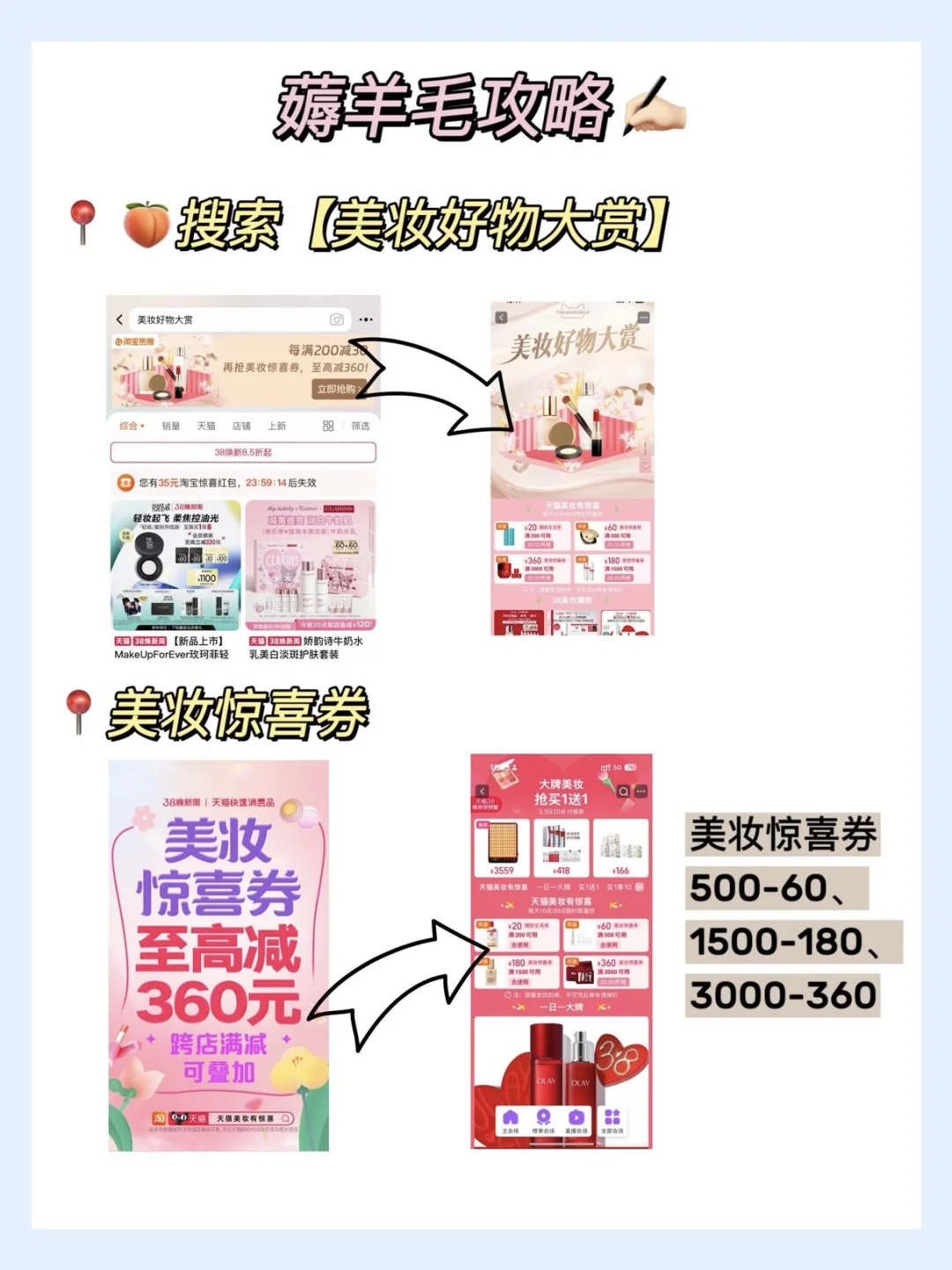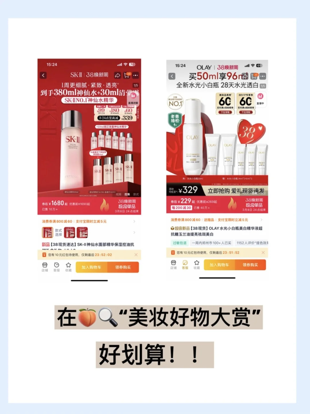 38焕新周的号角吹响啦 这波优惠不抓住,真的要等一年! 作为OLAY小白瓶和SK-II神仙水的忠实粉丝 每次活动必囤 这次38活动来了 我可是提前就做好了功课 活动时间要牢记⏰⏰⏰ 🔥预热期在2025年2月26日00:00:00 - 2025年2月26日19:59:59 提前做好功课把想买的都加🛒 💰定金期从2月27日20点到3月3日17点59分 果断付定金锁定心仪商品 🔆3月3日20点到3月8日23点59分尾款期 坐等收货就行啦 🍑这次大出🩸 优惠多得让人眼花缭乱 上🍑🔍“美妆好物大赏”进入会场 就能开启省钱购物之旅了 美妆惊喜券力度超大 1️⃣满500减60、满1500减180、满3000减360 2️⃣跨店满减每满200减30,全品类通用,尽情凑单,和美妆惊喜券叠加使用,优惠拉到最满 3️⃣会员购物金充值膨胀九折起,囤货党直接冲,能省不少钱。 听说OLAY小白瓶和SK-II神仙水买套装送正装量的小样 真的超划算! 这俩搭配用,效果1+1>2 而且关注店铺直播还有限时折扣和🧧雨呢 这么难得的活动 别犹豫 姐妹们赶紧加购吧!