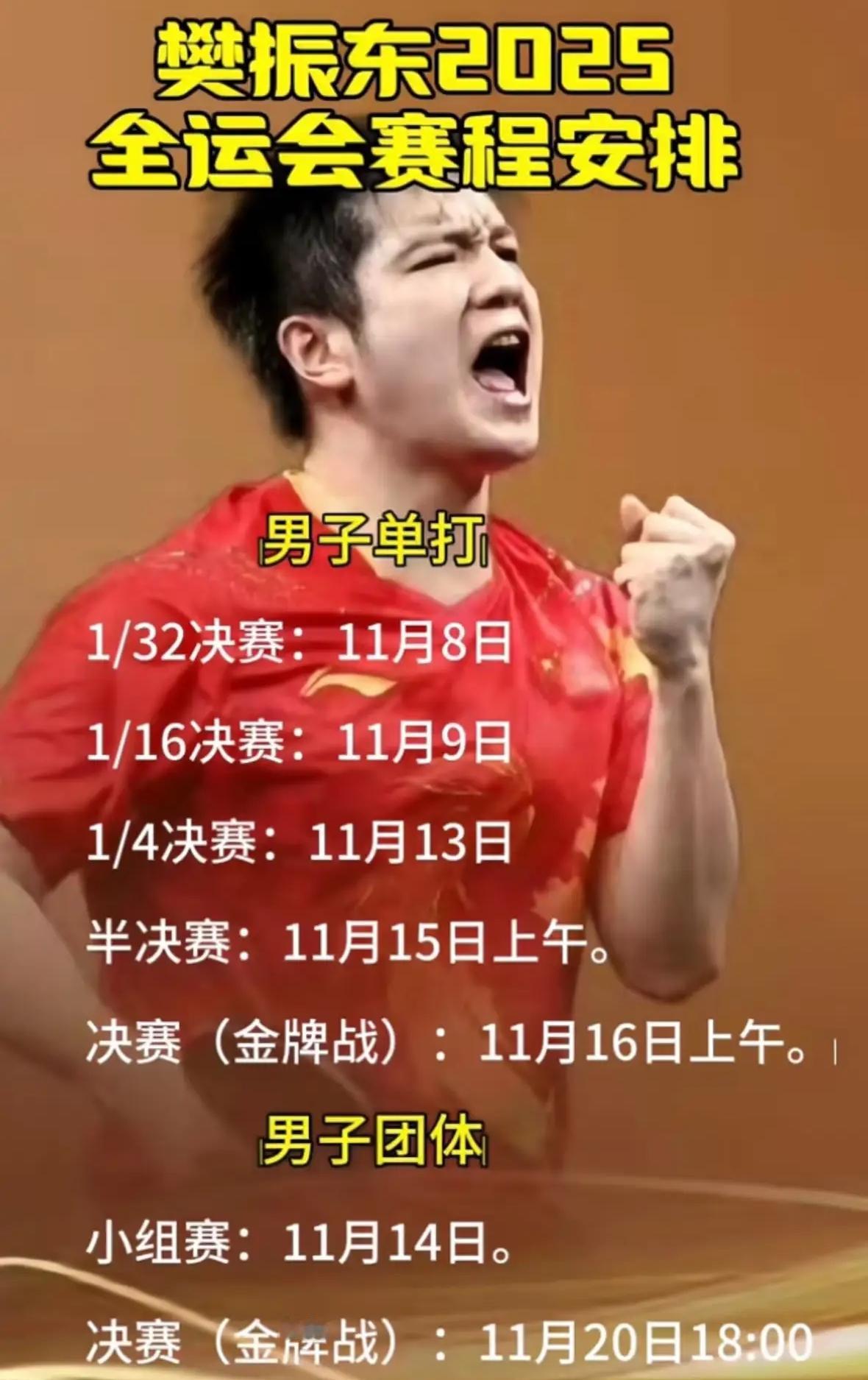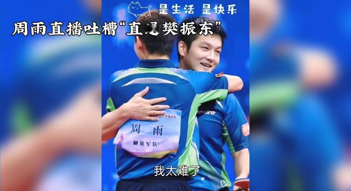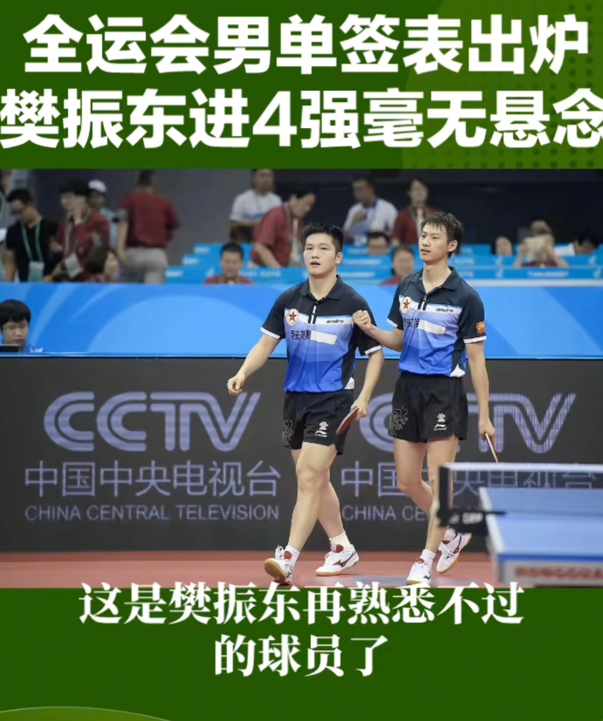 全运会男子单打签位表出炉,樊振东作为四号种子和一号种子王楚钦同处一个半区,两人有望会师半决赛。 樊振东的首轮对手是周雨,二人曾经是八一队友,在2017年天津全运会还一起拿下男双冠军! 周雨在直播时吐槽自己太难了,公开赛抽签总是抽到樊振东,十次抽签七次抽到樊振东,被誉为“直通樊振东”,这运气也太差了,和樊振东打球都有阴影了。(图片来源于网络侵删)