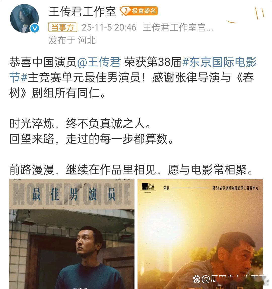 王传君工作室回应获奖王传君工作室回应艺人获奖:时光淬炼,终不负真诚之人。回望来路