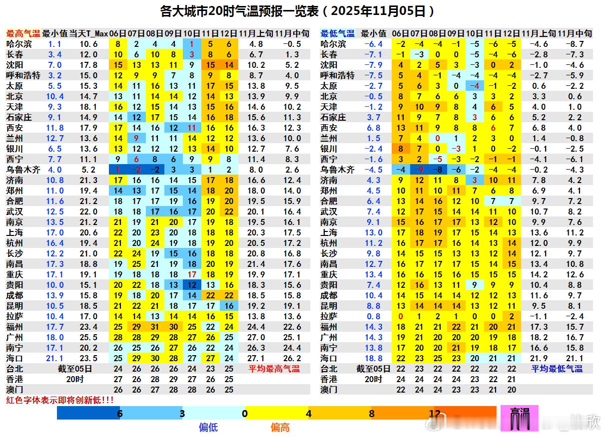 【气温多起伏】未来7天,气温呈现起伏多变的特征。未来2天长江以北因为冷空气+降水,气温下降。长江以南气温还有上升,导致南北气温差异加大。7日乌鲁木齐最高可能是零下2℃,福州同日最高29℃。之后8-10日有补充冷空气南下,南方多地气温也将下降。而北方将先于南方升温。