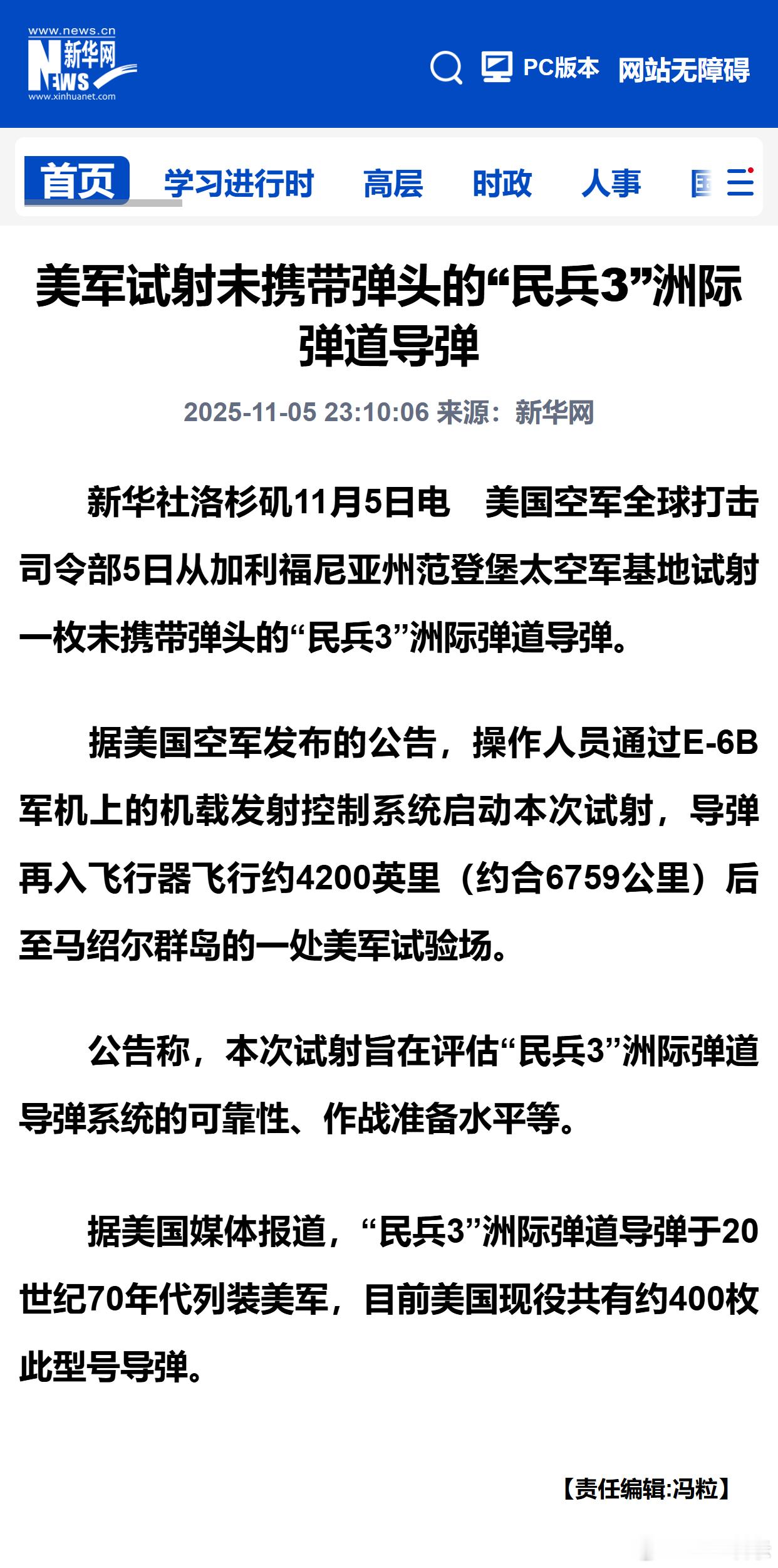 美军试射未携带弹头的“民兵3”洲际弹道导弹