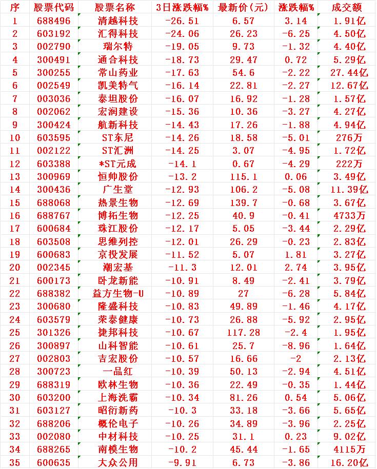 当心!11月6日,前3天主力大幅卖出的35名单 清越科技:3日涨跌幅 -26.51%,成交额 1.91亿元 汇得科技:3日涨跌幅 -24.06%,成交额 4.50亿元 瑞尔特:3日涨跌幅 -19.05%,成交额 4.40亿元 通合科技:3日涨跌幅 -18.73%,成交额 5.29亿元 常山药业:3日涨跌幅 -17.63%,成交额 27.44亿元 凯美特气:3日涨跌幅 -16.14%,成交额 12.67亿元 泰坦股份:3日涨跌幅 -16.07%,成交额 1.57亿元 宏润建设:3日涨跌幅 -15.36%,成交额 4.27亿元