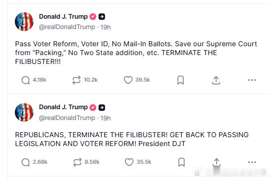 共和党人,终止冗长辩论!回到立法和选民改革的正轨上来!特朗普总统