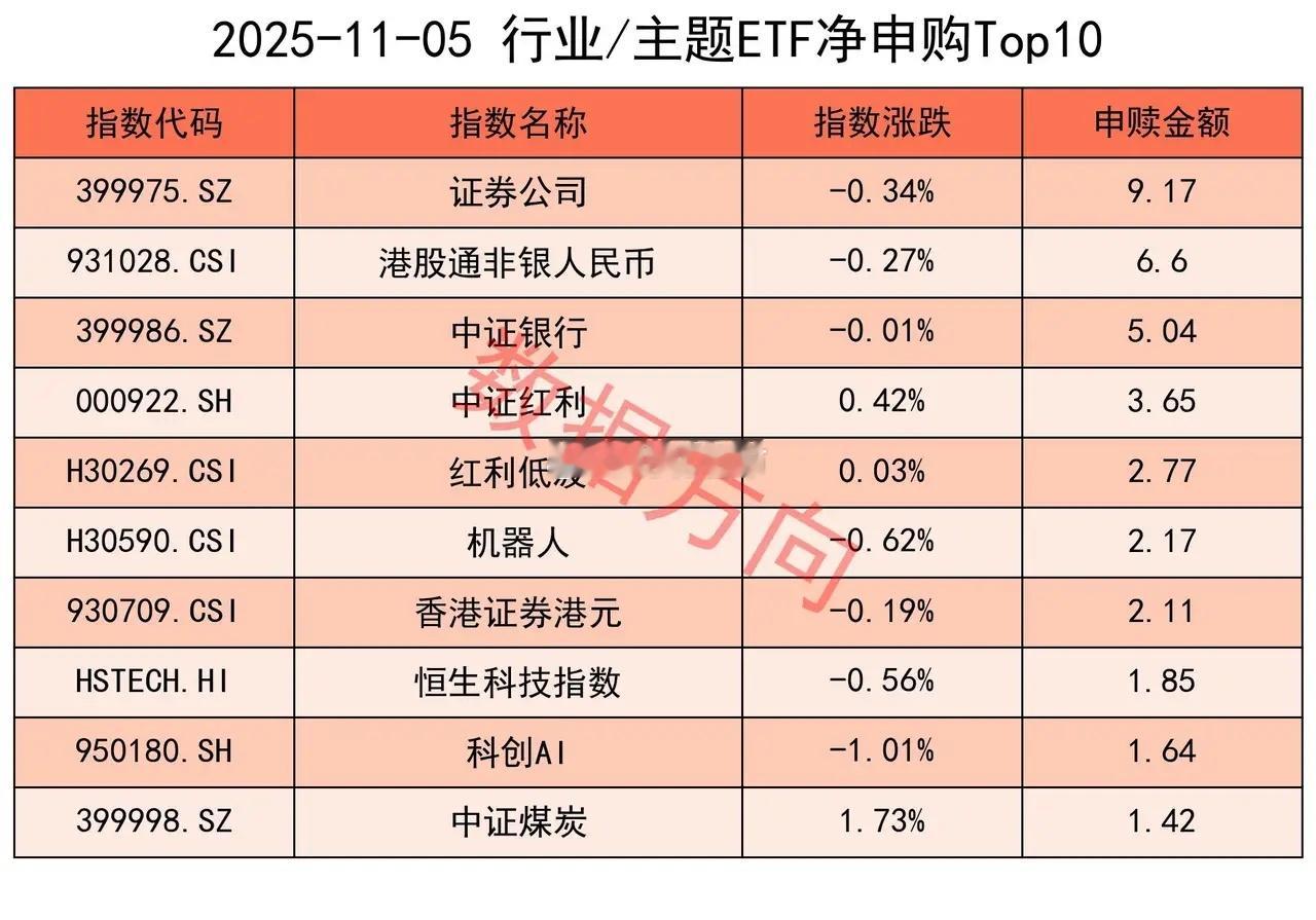 中证银行指数(5.04亿)、中证红利指数(3.65亿)、红利低波指数(2.77亿)、中证煤炭指数(1.42亿),一起进入申购榜;红利指数(-0.36亿)进入赎回榜。