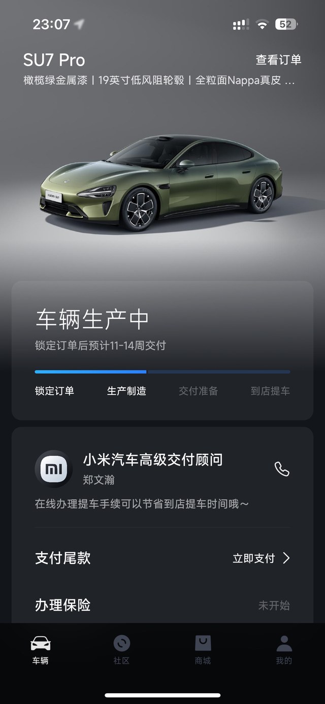su7pro的交付,太伤米粉的心了 发布会当天锁单的车,到现在还没交付,雷总天天喊加速,今天已经是第12周了, 给售后打电话,永远是帮我落实,给我回复,然后一个回复也没有 给交付群发信息,永远是他也不知道 好好的一个车,从最初的期待到现在的麻木,已经完全没期待,要不是不能退车,现在已经去买问界m5,售后跟不上,服务跟不上,一问三不知 主要是现在13周甚至20周都有交付的车,11周的车还没消息,不知道小米的交付逻辑是什么,只能说大意了,第一次也是最后一次了