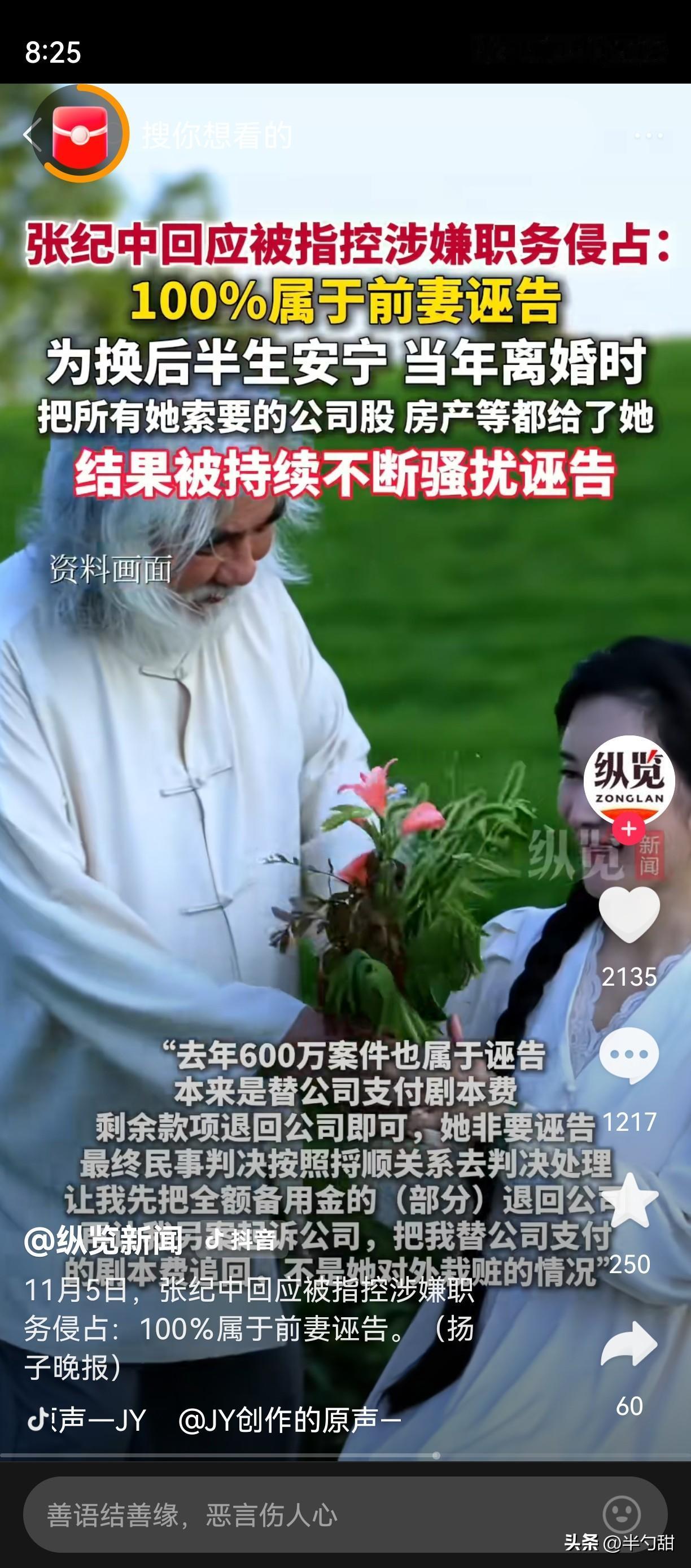 张纪中老先生真是晚年不保啊,和前妻离婚后居然和助理结婚,这就是著名的小娇妻了。 没想到现任小娇妻的炫富,炫豪宅,炫上亿身家,还炫喜提小千金,这个年纪还能生娃,怎么不遭前妻的恨,当年别人和你在一起的时候,可没有这么好的身家背景。 现在被湖南美猴王影业公司报案,指控张纪中职务侵占800万啊,这家公司就是前妻的,所以说,说破天也是带着情感“厮杀”啊。 当初其实他是挺反对小娇妻这样炫富,以他的年龄阅历会不知道会掀起什么风浪,可经不住小俏妻说“直播赚钱”啊,在尝到直播卖货带来的甜头过后,便渐渐默许了。 如今,这风浪更比一波浪啊,翻出2017年代的旧闻,其实这官司不是第一次打了,现在又继续翻出张纪中利用职权,在当时的职务中挪用资金,在对比前段时间小俏妻的高调炫富。 只能说,张纪中老先生,这一辈子都是在和女人纠葛啊。 (图片来自网络视频)