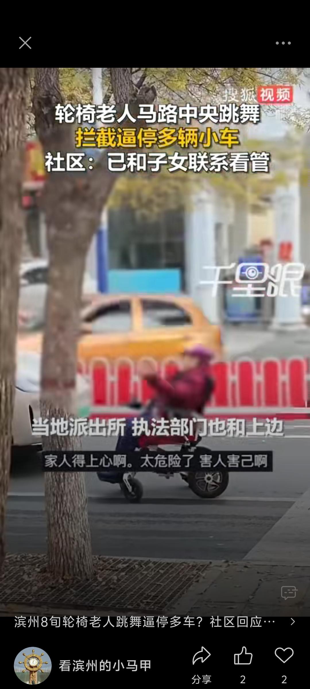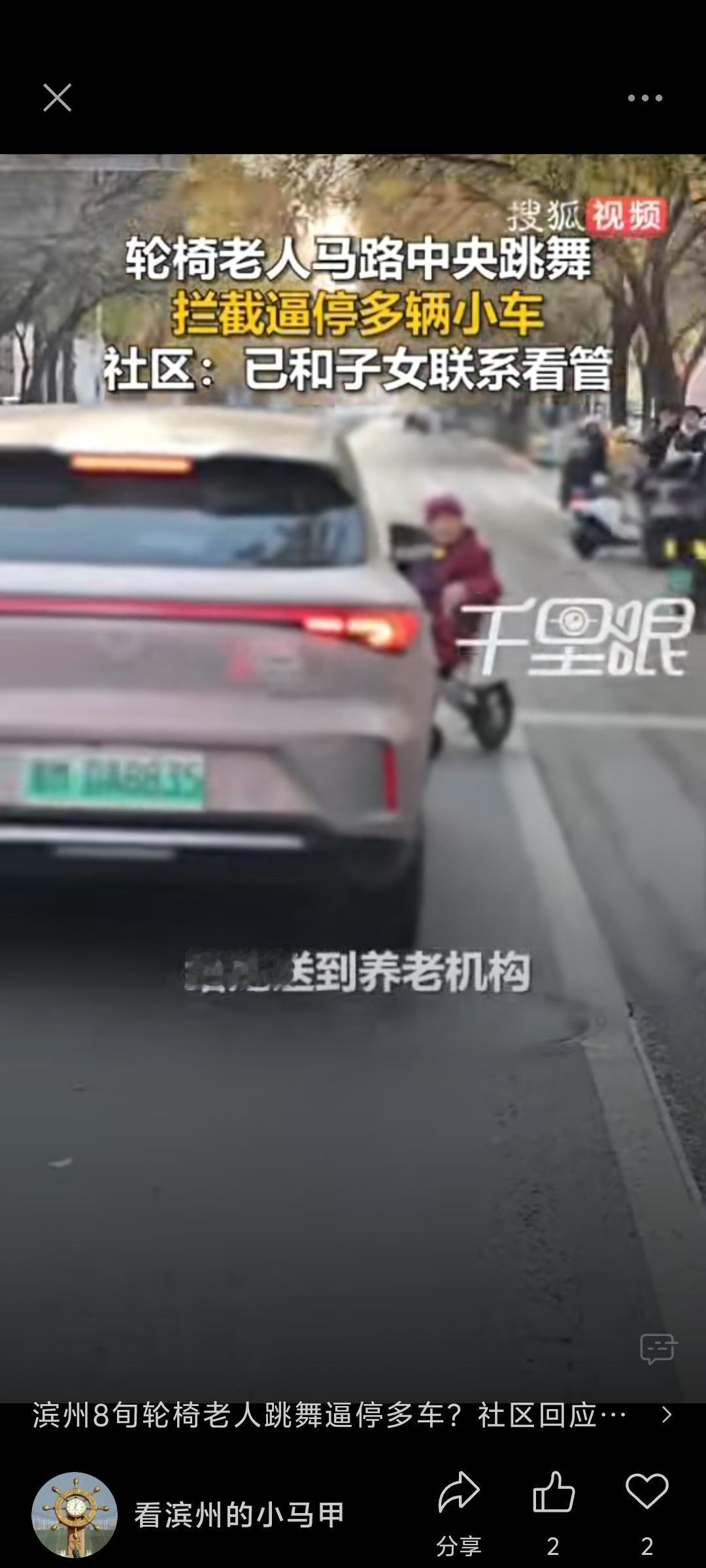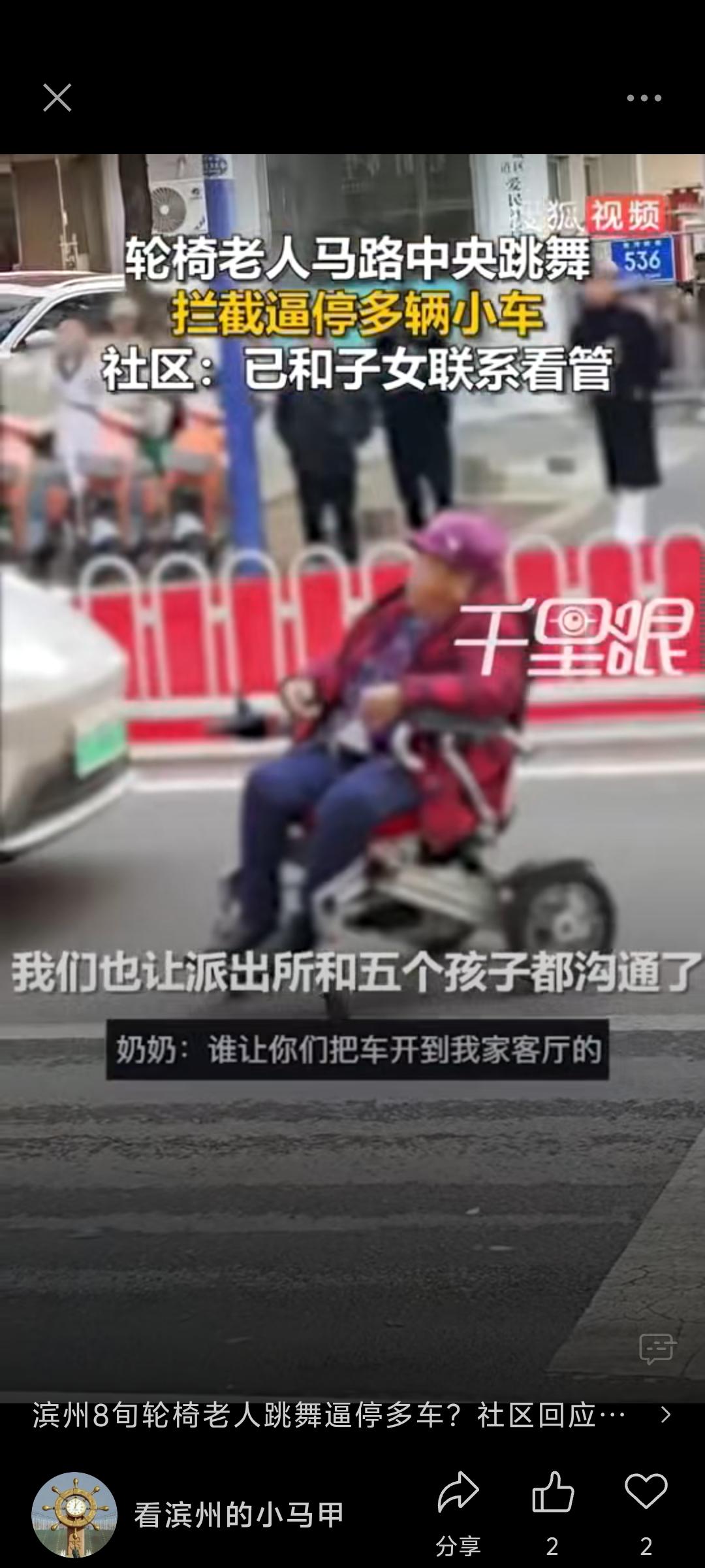 滨州8旬轮椅老人跳舞逼停多车?社区回应:已和5名子女沟通看管 据搜狐千里眼: 11月3日,山东滨州。一老人时而坐轮椅时而站着,在马路中央挥手帕跳舞,逼停多辆小车。 11月5日,当地社区工作人员表示,事发后和民警一起进行了劝阻沟通,老人80多岁有5名子女,建议将老人送去养老院,但子女不同意。 高龄群体违规行为存在执法难、追责难问题,需探索柔性执法与监护制度联动。表面是交通纠纷,实则是老龄化社会下家庭监护、社会支持与法律执行的多重问题。需避免标签化"坏老人",转而聚焦建立预防性干预体系......