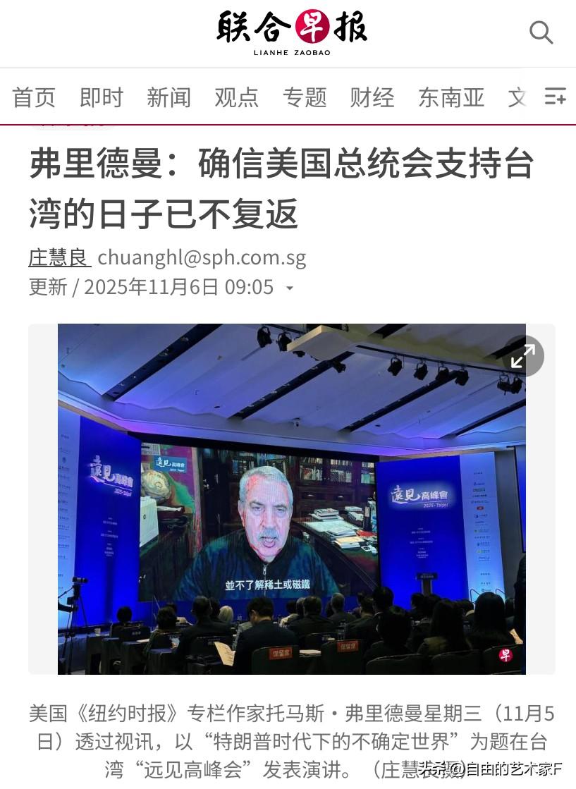 美国《纽约时报》专栏作家托马斯·弗里德曼11月5日参加台湾“远见高峰会”演说时:强调如今的世界局势变了,中美关系才是美国最为重要的关系,除此之外任何都不重要。 他呼吁台当局认清现实,过去那种可以确信美国总统支持台湾的日子,已经一去不复返了,建议台湾同大陆和平共处默默发展,要不然将沦落成乌克兰家破人亡的那样的局面。 评论两句:这个专栏作家的认知可比赖清德当局要清楚得多呀,面对着中国的强势崛起,美国的态度已经变成了“软抗中不保台”,这样的变化,不由得让人想起了一句话,美国前白宫副国安顾问博明曾说过,如果武统台湾,台湾必须独自抵挡两个月,美国才能赶到。现在就想问问赖清德当局到底扛不扛揍,如果不扛揍的话,建议还是夹起尾巴做人。台独只有死路一条,他们每一次的极端言论都会成为祖国加快统一步伐的推进剂。