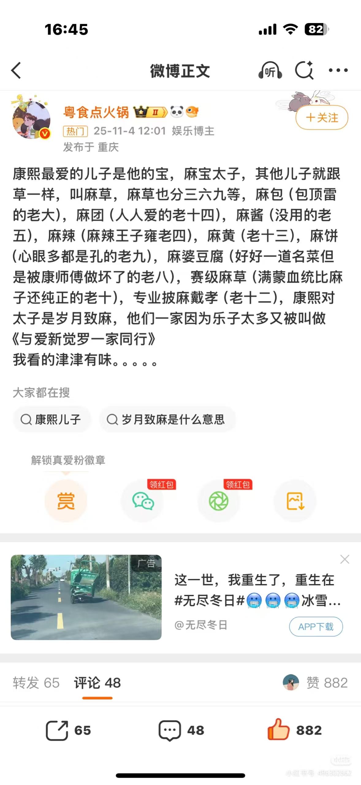 清史圈给康熙儿子们起的外号也太精辟了! 康熙心里简直是“一碗水端不平”到极致 太子是独得恩宠的“麻宝”👑 其他儿子直接沦为“麻草”,还得按三六九等排辈 最后摘得胜利果实的老四,最后外号“麻瓜” 最绝的是老十!被喊“赛级阿哥”名不虚传,本来血统纯到离谱 妈是温禧贵妃 来自满洲镶黄旗钮祜禄氏,亲姨母还是孝昭皇后 外祖父更是康熙初年辅政大臣遏必隆 不过基因这东西真的玄学 老十虽然血统顶配,智商却和九子夺嫡的其他阿哥有壁 也就比蒙古老太太养大的老五略胜一筹 只能说纯血不一定等于高智商啊哈哈哈~ 现在好了,变混血王子了