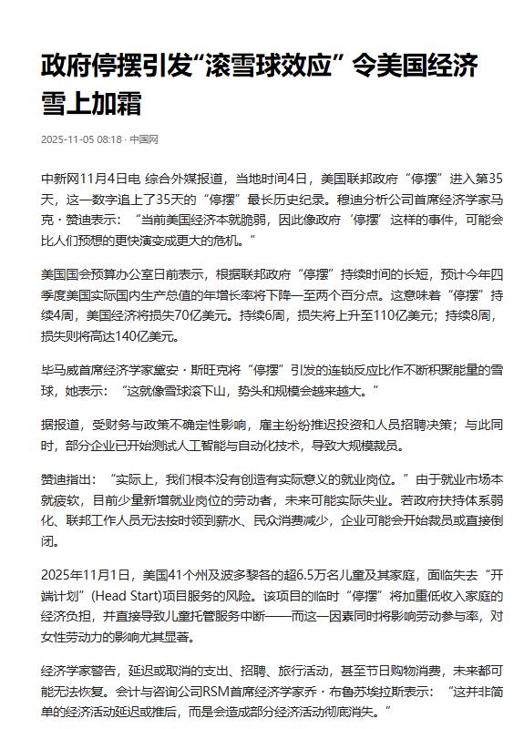 就在昨天,美国正式进入“停摆”状态35天,这已经是美国历史上第35天的“停摆”,同样追平了美国历史上“停摆”的最长纪录——35天。 为什么会停摆呢? 两党在拨款法案上如此争斗,根本就是为了各自党派利益。 他们只想着争权夺利,完全不顾老百姓死活,才让国家陷入停摆困境。 这场闹剧的核心争议点明晃晃地摆着——医保福利开支,可两党从头到尾都没想着怎么解决问题,只忙着互相甩锅推卸责任。 民主党一口咬定共和党不肯让步才导致医保补贴泡汤,明年参保人的保费每人每年要多花1000美元,400万美国人可能直接失去医保,有智库甚至算出有些人的保费会暴涨600%。 共和党则反过来指责民主党故意卡脖子,把4200万低收入民众的食品救济金当成要挟的筹码,特朗普在社交媒体上喊着“只有民主党让政府开门才能发救济金”,可没人真的动手解决问题。 这已经不是两党第一次拿政府运作当赌注了,2018年底到2019年初那回35天的停摆,就是因为共和党要57亿美元建边境墙,民主党死活不同意,最后闹得全国鸡飞狗跳。 只不过这次更过分,连基本的民生保障都懒得装样子维护了。 上回停摆时农业部还提前把整月食品福利一次性发了下去,这次直到停摆一个月后,才靠两位联邦法官裁定,政府才不情不愿动用应急资金,可那点钱根本不够——SNAP计划每月要花80到90亿美元,应急资金池里只有50多亿,只能半额发放,还得等各州调整系统,钱能不能到账、啥时候到账都是未知数。 那些靠补充营养援助计划过日子的家庭,只能眼睁睁看着冰箱空下去,而两党还在参议院里反复折腾,第14次否决临时拨款法案时,支持票连60票的门槛都没到,和之前两次投票结果一模一样,摆明了就是故意耗着。 两党只顾着争权夺利,早就把“为人民服务”的口号抛到九霄云外了,机场里的乱象最能说明问题。 全美1.3万名空中交通管制员和5万名机场安检员工被迫无薪上班,本来就长期缺人的空管队伍彻底扛不住了,纽约地区近90%的空管人员没到岗,10月底的一个周末就有4600到5800架次航班延误,拉瓜迪亚机场一半航班晚点,平均延误140分钟,安检排队能排3小时以上。 交通部长都急得警告要关闭部分空域,可两党领袖连坐下来好好谈的心思都没有,毕竟机场乱不乱、旅客急不急,比起争取选民支持的政治利益,根本不值一提。 更讽刺的是,再过不久就是感恩节旅行季,到时候人流量一上来,航空系统大概率要瘫痪,副总统都说“可能是一场灾难”,可两党依旧我行我素。 小企业的日子更难熬,政府停摆期间,小企业管理局每天卡着约1.7亿美元的政府担保贷款不放行,到10月底累计搁置的资金已经高达45亿美元。 那些靠现金流周转的餐馆、零售店,本来就薄利多销,这下贷款拿不到,工资都发不出来,员工家庭的生计直接被断了来源。 而这背后是真金白银的经济损失,国会预算办公室说四季度GDP年增长率要降1到2个百分点,停摆4周损失70亿,6周110亿,8周就奔140亿去了,英国广播公司更算出每周损失约150亿。 可这些数字在两党眼里,似乎只是用来攻击对方的工具,民主党骂共和党造成经济危机,共和党怪民主党不顾财政平衡,没人真的为这不断扩大的损失心疼。 更离谱的是,连国家决策都跟着遭殃。 就业、零售、住房这些关键经济数据全停更了,美联储、企业和市场就像瞎了眼的飞行员,在“盲飞”状态下做决定,误判风险直线上升。 这可不是小事,政策踩错油门或刹车,最后买单的还是普通民众。 可两党根本不在乎这种长远影响,他们早就把“临时拨款”当成了常态,2024年就两次濒临停摆,都是卡着最后期限才勉强过关,这次干脆破罐子破摔,把停摆从“事故”变成了“制度性症状”。 哈佛和杜克大学的教授都看得明白,现在的停摆就是党派策略,两党都想靠制造危机给对方施压,拿民众痛苦换选票,这种玩法早就成了美国政坛的通病。 说到底,这35天的停摆就是场彻头彻尾的政治闹剧,两党把国会变成了掰手腕的擂台,拨款法案是筹码,4200万靠食品救济过活的人、320多万受航班影响的旅客、无数濒临倒闭的小企业,全成了他们争权夺利的炮灰。 只要能给对方扣上“造成危机”的帽子,只要能在选民面前刷存在感,哪怕经济损失上百亿,哪怕民生保障全线崩溃,他们都觉得值。 这种眼里只有党派利益、没有百姓死活的操作,把所谓的“民主”演成了笑话。