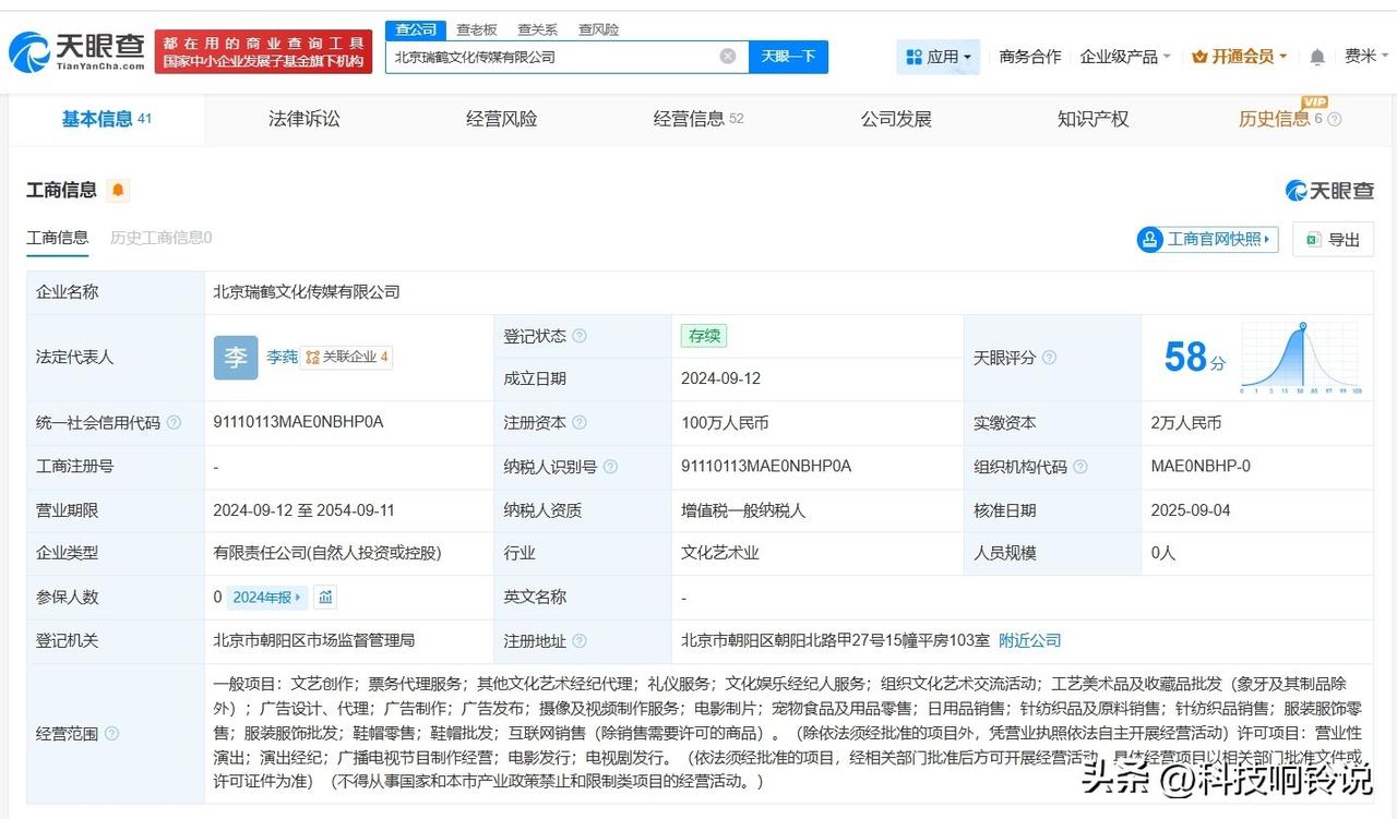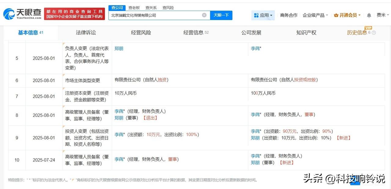【梓渝退股名下经纪公司 梓渝仅持股名下经纪公司三个月】 天眼查工商信息显示,近日,北京瑞鹤文化传媒有限公司发生工商变更,郑朋(梓渝)退出该公司股东。 北京瑞鹤文化传媒有限公司成立于2024年9月,法定代表人为李莼,注册资本100万人民币,经营范围包括文艺创作、票务代理服务、其他文化艺术经纪代理等。股东信息显示,该公司现由李莼全资持股。变更记录显示,今年8月,该公司发生工商变更,郑朋(梓渝)卸任法定代表人、董事,由李莼接任,同时新增郑朋(梓渝)为股东,注册资本由10万人民币增至100万人民币。 天眼查信息: