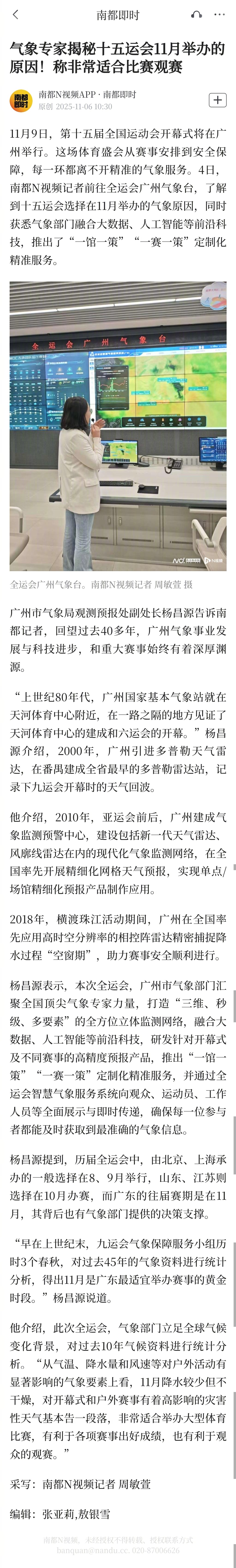 #十五运在11月举办是有原因的#【气象专家揭秘十五运会11月举办的原因!称非常适合比赛观赛】#十五运每个场馆都能收到精确气象信息#11月9日,第十五届全国运动会开幕式将在广州举行。这场体育盛会从赛事安排到安全保障,每一环都离不开精准的气象服务。4日,南都N视频记者前往全运会广州气象台,了解到十五运会选择在11月举办的气象原因,同时获悉气象部门融合大数据、人工智能等前沿科技,推出了“一馆一策”“一赛一策”定制化精准服务。