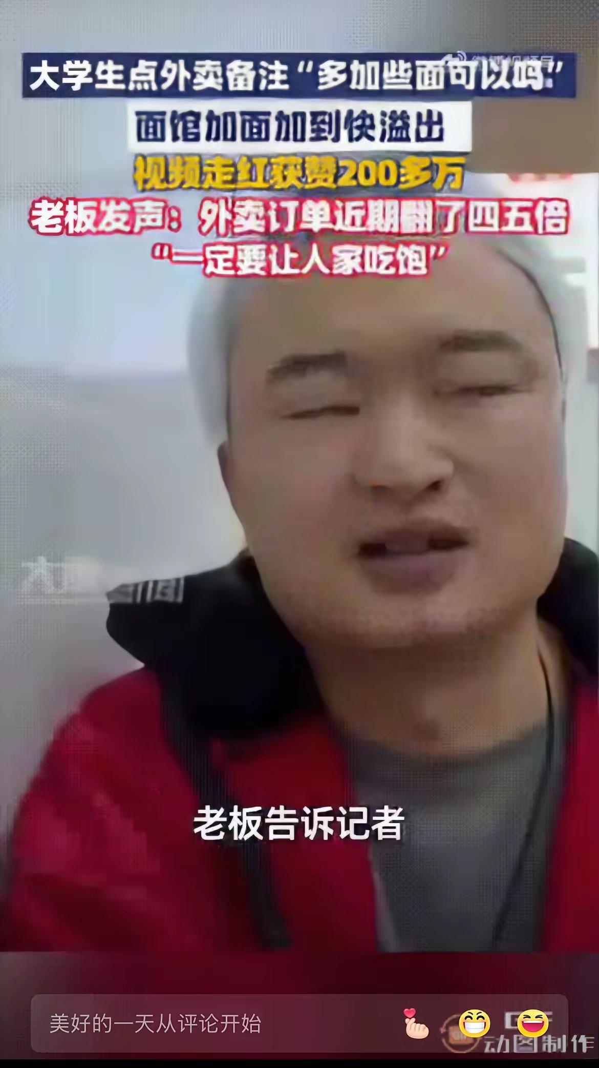 武汉大学生点面求加量引出暖心老板!穷学生备注想吃饱,老板愣把外卖盒塞得合不拢盖,视频炸出全网苦命人回忆杀。这湖北汉子自曝当年啃馒头喝面汤的穷学生经历,如今订单暴增四倍死活不涨价。大伙儿都馋这份雪中送炭的江湖气。 来自大象新闻