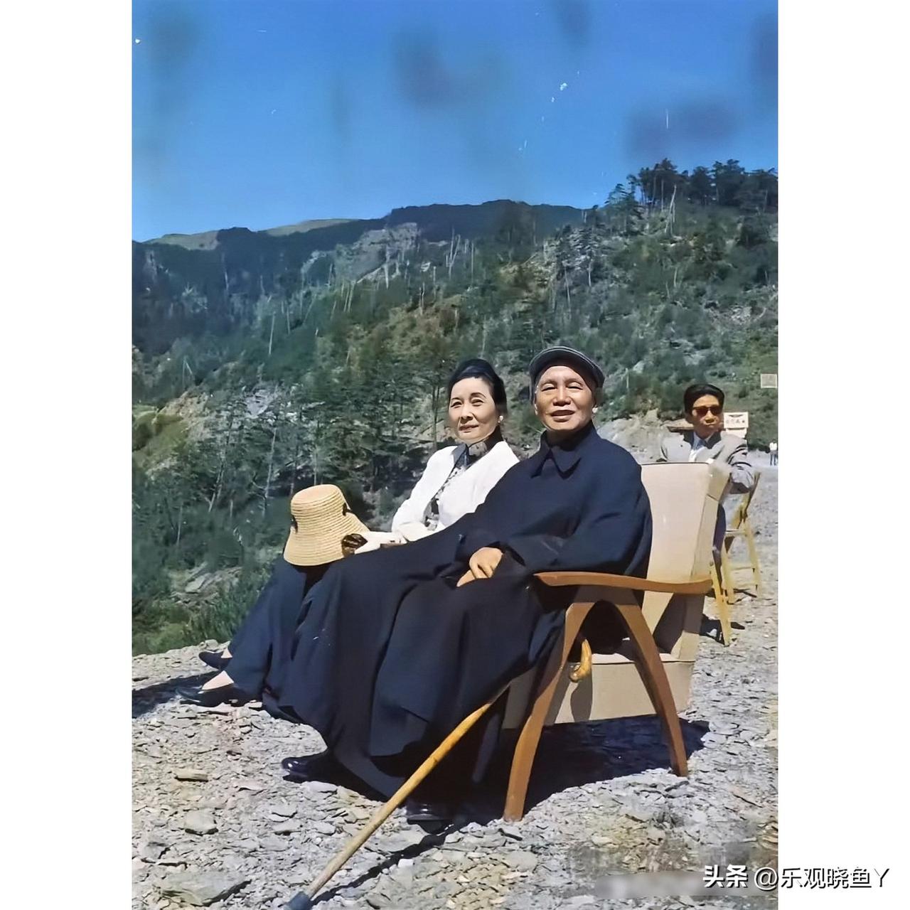 这是晚年的蒋中正和夫人宋美龄爬山小憩时的一张老照片,拍摄于上世纪60年代。这绝非演戏,也不是电视剧里的演员,而是夫妇二人当时的真实样貌。衣着依旧是一丝不苟的精致,小憩时还要随身带着一把沙发椅。