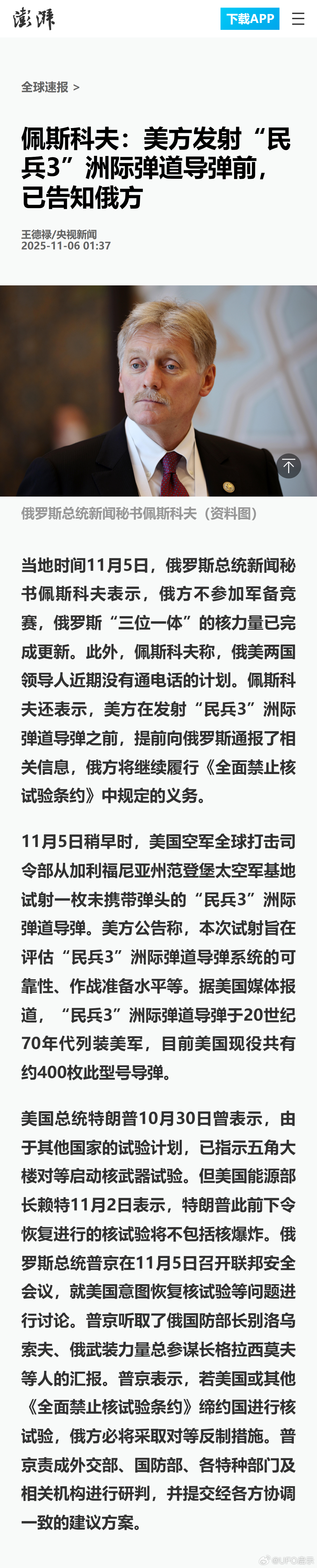 佩斯科夫:美方发射“民兵3”洲际弹道导弹前,已告知俄方