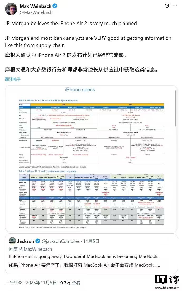 曝iPhoneAir后续机型仍在路上曝苹果未砍iPhoneAir后续机型【摩根大